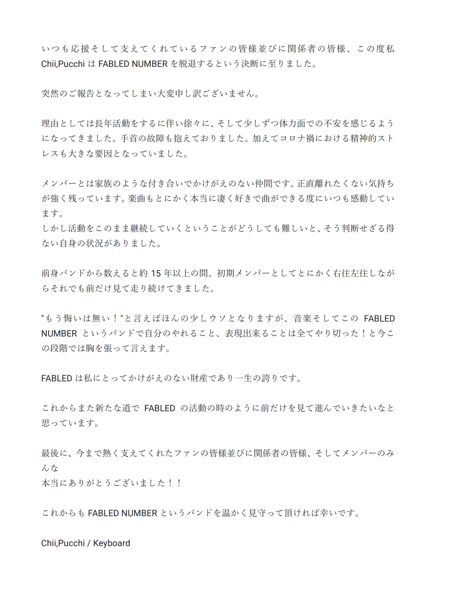 大阪の6人組ロックバンドFABLED NUMBERがKeyboardのChii,pucchiの脱退を発表した。