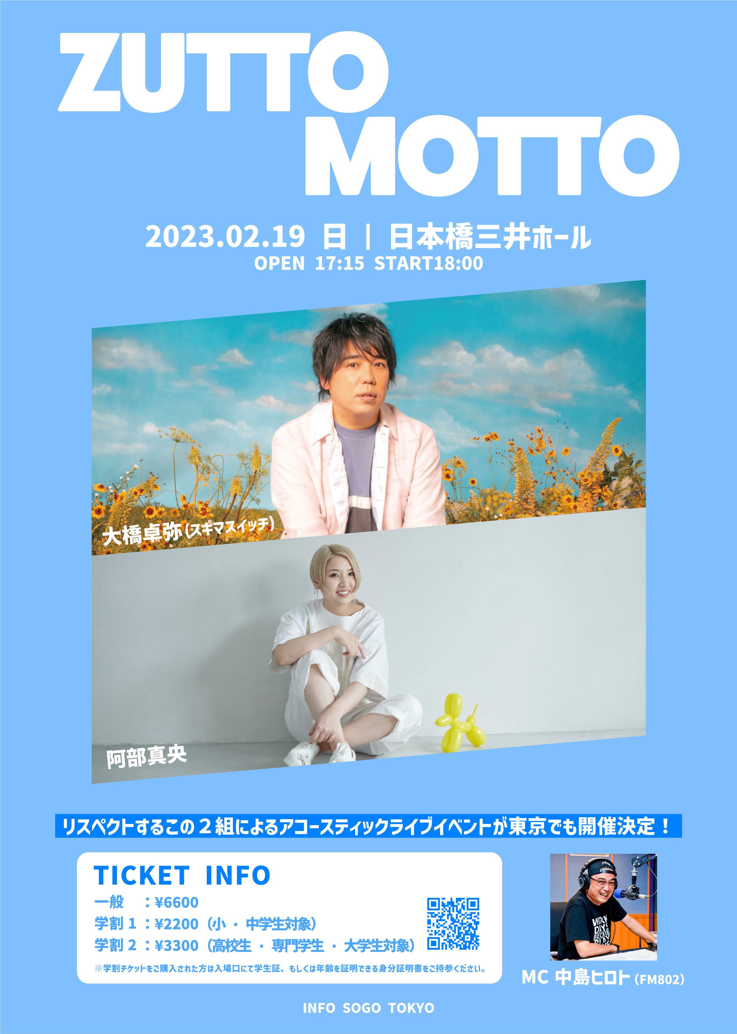 大橋卓弥(スキマスイッチ)と阿部真央が、アコースティックライブイベント『ZUTTOMOTTO』を行うことが発表された。