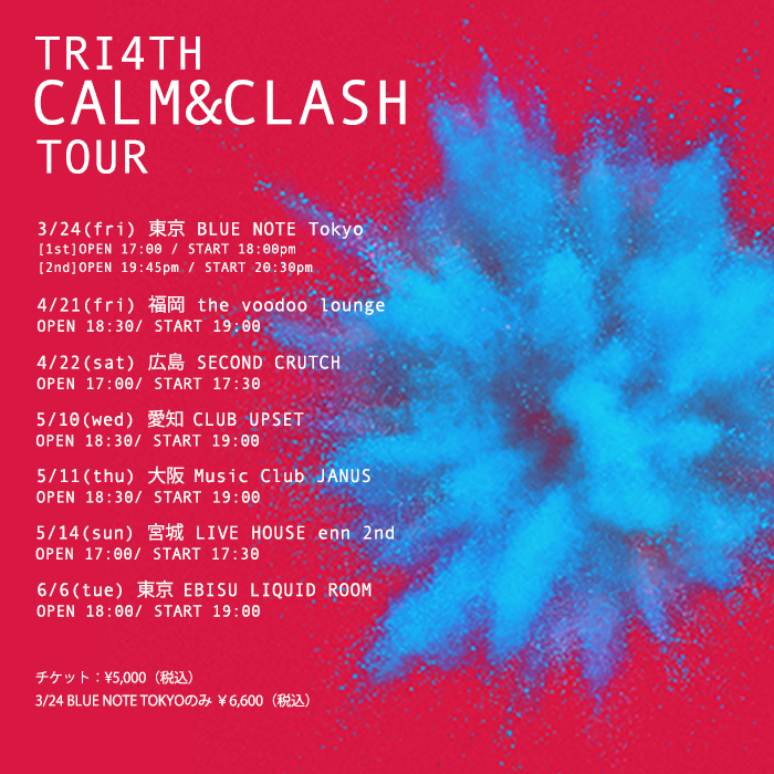 ツアータイトルにもなっている2月15日発売のアルバム『CALM&CLASH』は、TRI4THが持つ美しく綺麗な一面と刺激的で激しい一面とが共存し合う、TRI4THとして最新で最高傑作の一枚となっているとのこと。