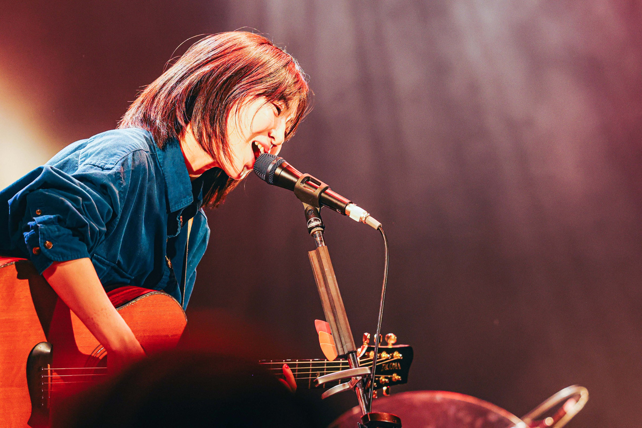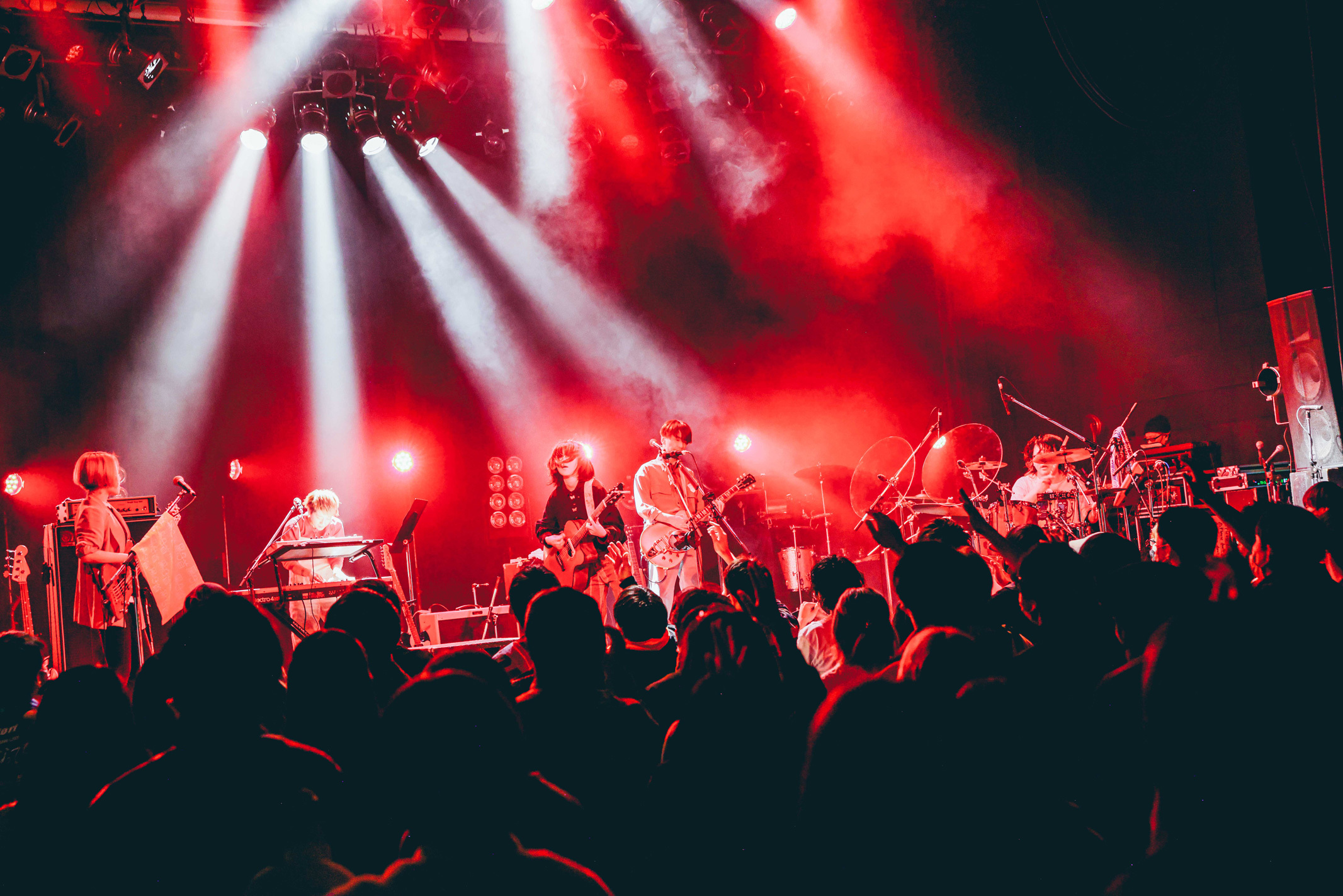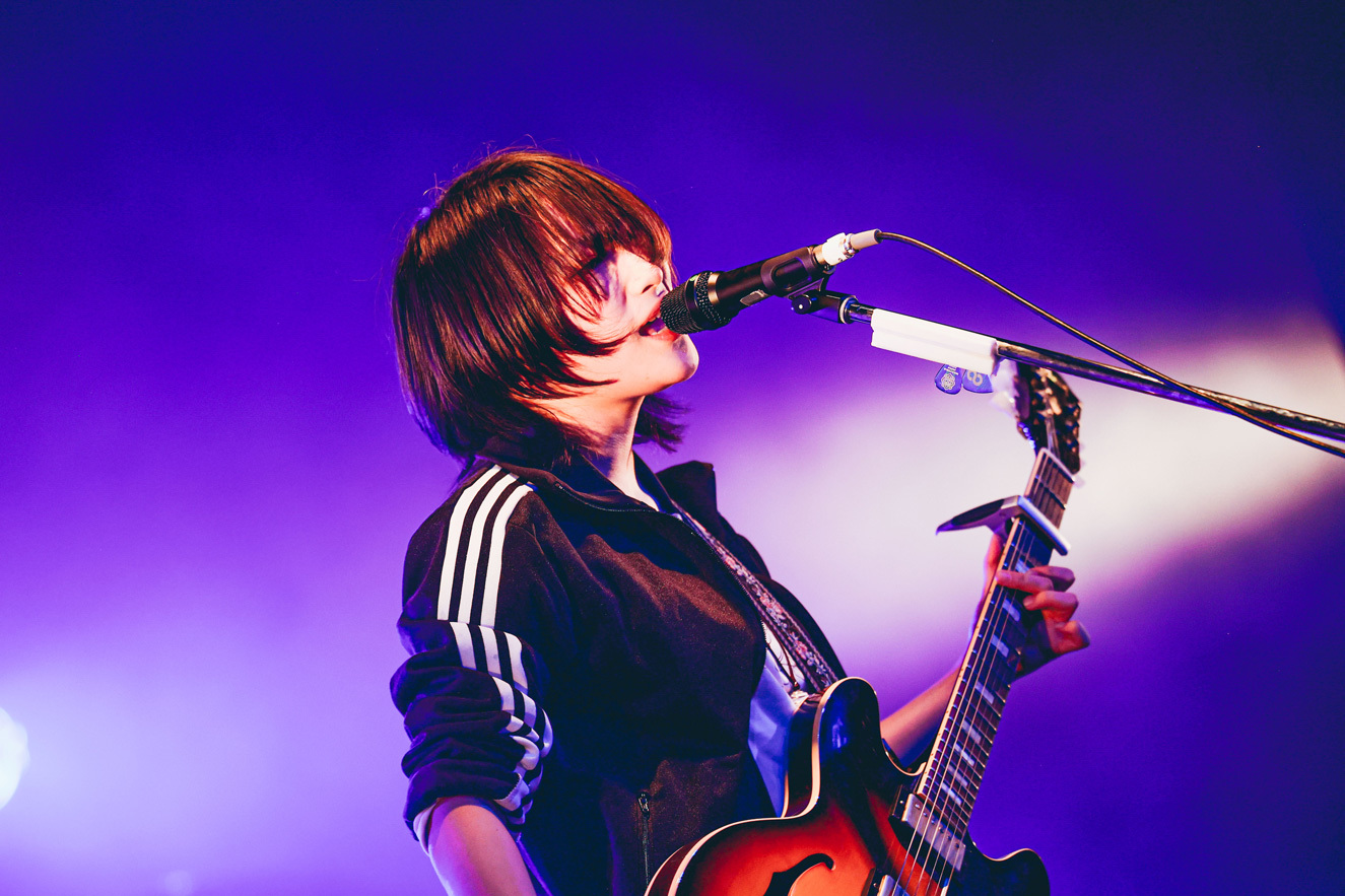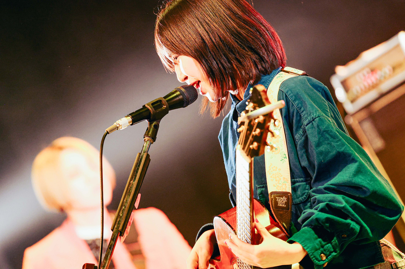 2番手は3ピースバンドの黒子首。サポートに曽根巧(Gt)と秦千香子(Key)を迎えた5人編成で登場した。1曲目は堀胃あげは(Vo.Gt)の弾き語りから、田中そい光(Dr)のコーラスが柔らかく重なり「クールに戦え」を演奏。温かく美しいサウンドと、強固な意志を感じる歌詞のバランスが絶妙だ。楽曲の余韻に入り込んでいると、間髪入れずに田中のカウントからステージがライトアップして「あいあい」へ。ホーンサウンドも入り、あっという間に多幸感に包まれた。堀胃は1曲目よりも明るい歌声をパワフルに響かせる。みと(Ba)も、手が上がった客席を見て嬉しそうに笑顔を浮かべていた。続く「やさしい怪物」では、堀胃の歌声のバリエーションの豊富さが際立った。時に囁くように、時にハスキーに、時に柔らかく、時にパワフルで、時に伸びやかだ。声そのものが楽器のようで、聞いているこちらもワクワクする。田中もボーカルに参加し、表現の幅をさらに広げていた。
