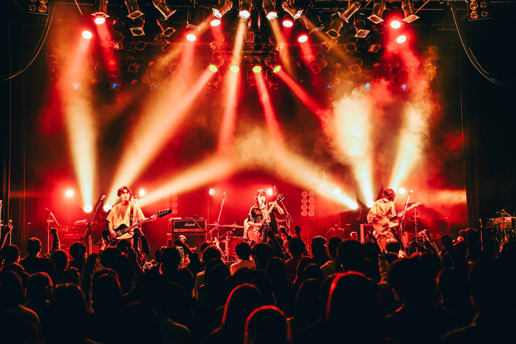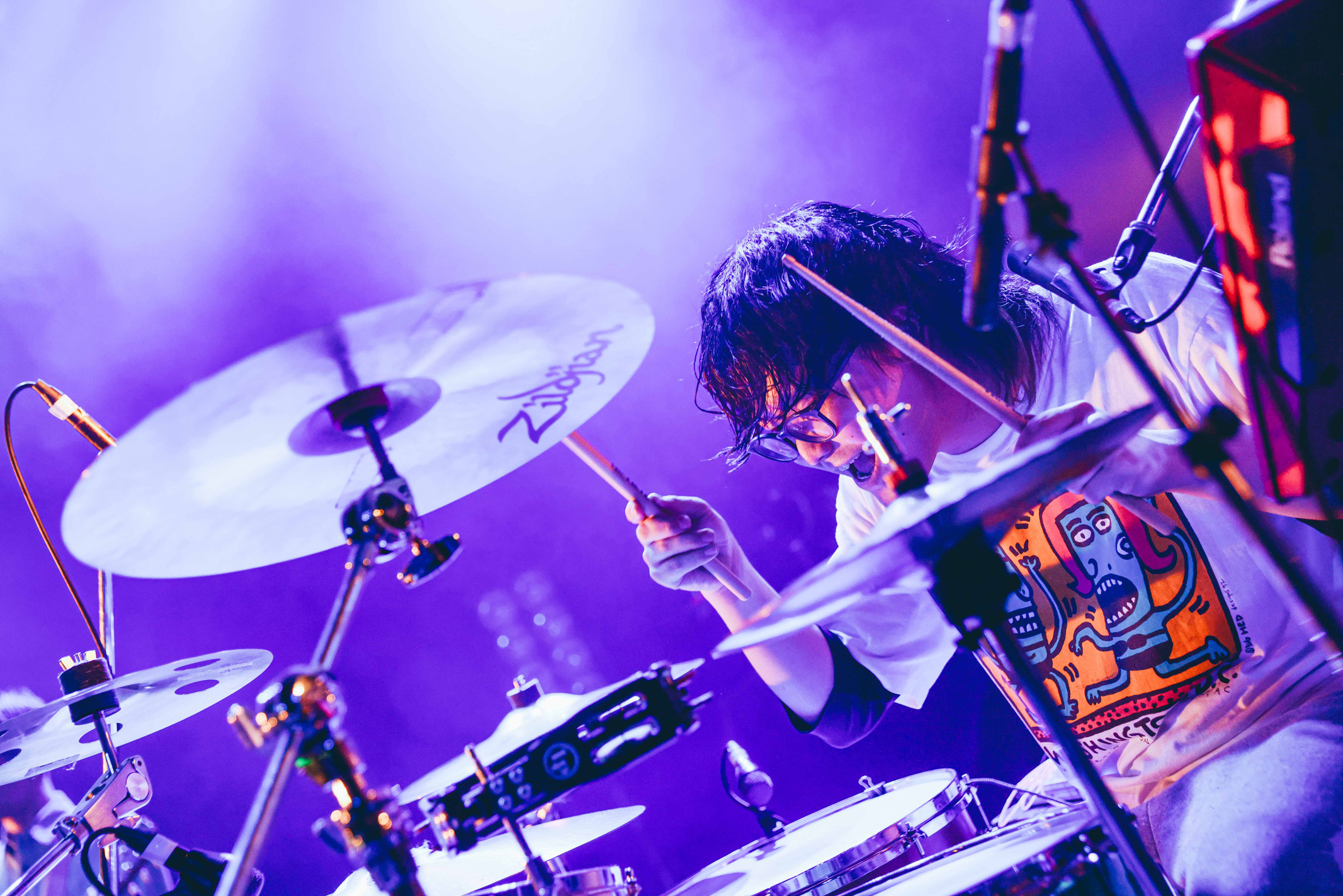 新作アルバムからは「サラバ宇宙、彼方未来」と「SONiC」を連続でドロップ。ドラムの凄まじい音圧や激しいギタープレイに牽引されて、客席の躍動感も増していく。ロックバンドの精神性をこれでもかとぶつけるパワフルなサウンドが、最高に気持ち良い。そんな客席を見て「結構ついてきてんね! まだまだいけそうだね」と嬉しそうに笑顔を見せ、「こっからもう一段階いけますか大阪」とさらに客席を煽る。