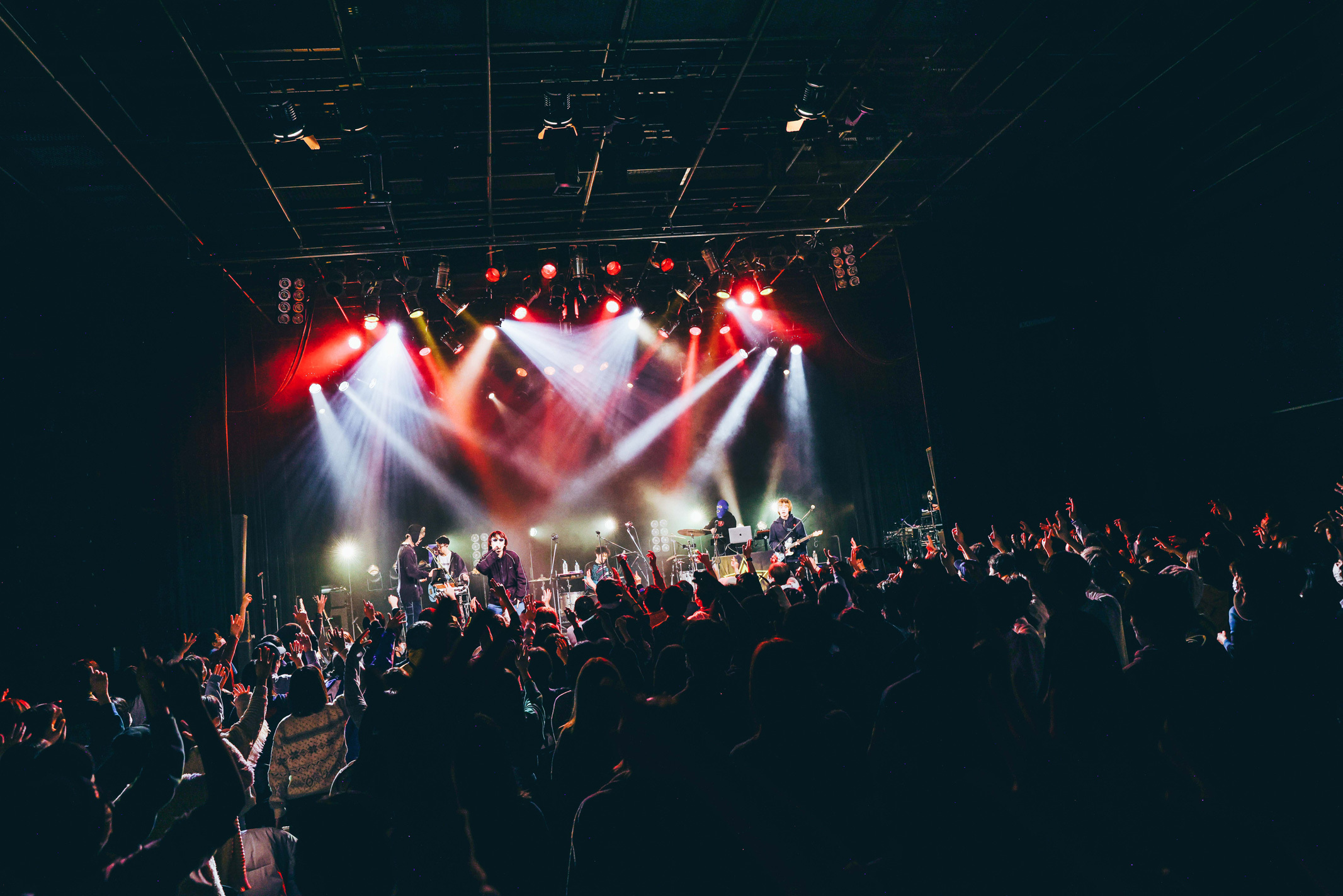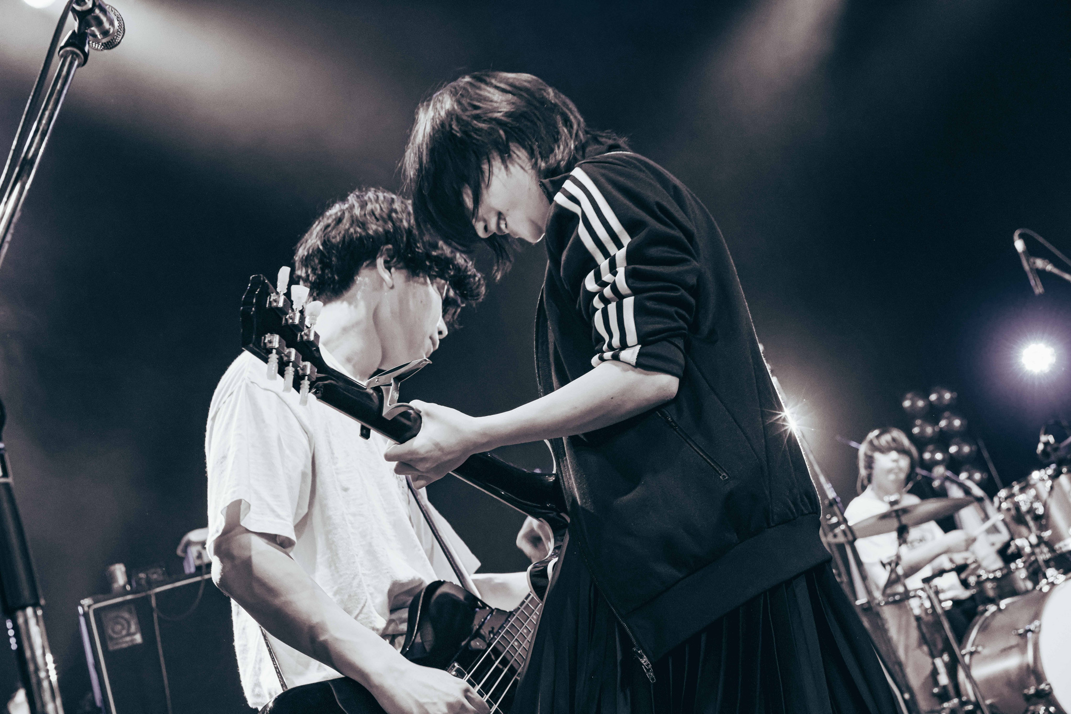 後半は「おぼえたて」「青鬼ごっこ」「Driver」と捻りのある楽曲を連続で演奏。どこか懐古的な感情を抱かせる独自のサウンドスケープを描き出し、会場を黒子首ワールドに導いた。ラストソングの前には客席のクラップをバックになぜか縄跳びを始める田中。「目的は何?」と堀胃に突っ込まれつつ、「トビウオ愛記」で盛り上げた。クセになるメロディに体が自然に揺らされる。客席は一斉に手を左右に振り、最高の一体感を生み出して、会場の熱をまたひとつ引き上げた。