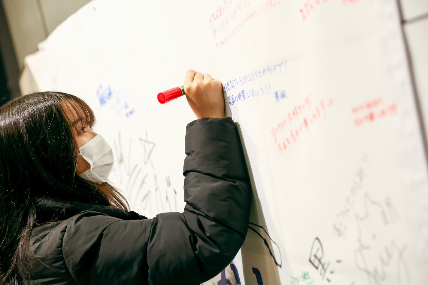 当日、学生の誘導で会場に入ると、壁に張られたフラッグにコメントを書いてアーティストにメッセージを届けようという来場者参加型の企画も実施されており、マジックを持った学生が参加を呼びかけていた。会場内をあちらこちらに動き回っている人もいれば、少し緊張した面持ちで対応する人もいて、それぞれの持ち場でイベントの成功に向けて一丸となって行動する学生の姿は、初々しくて眩しかった。