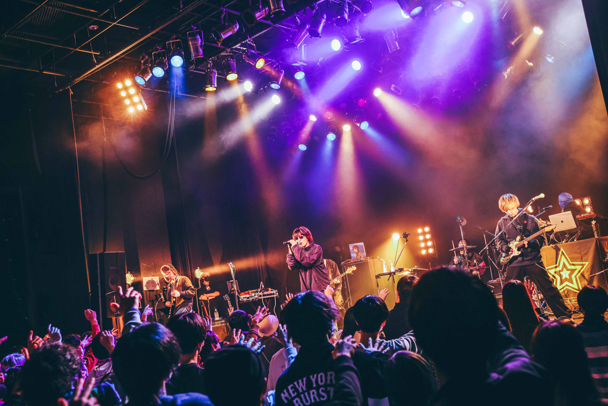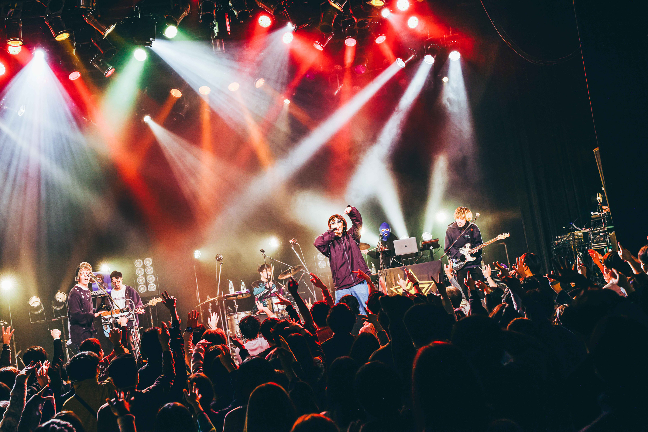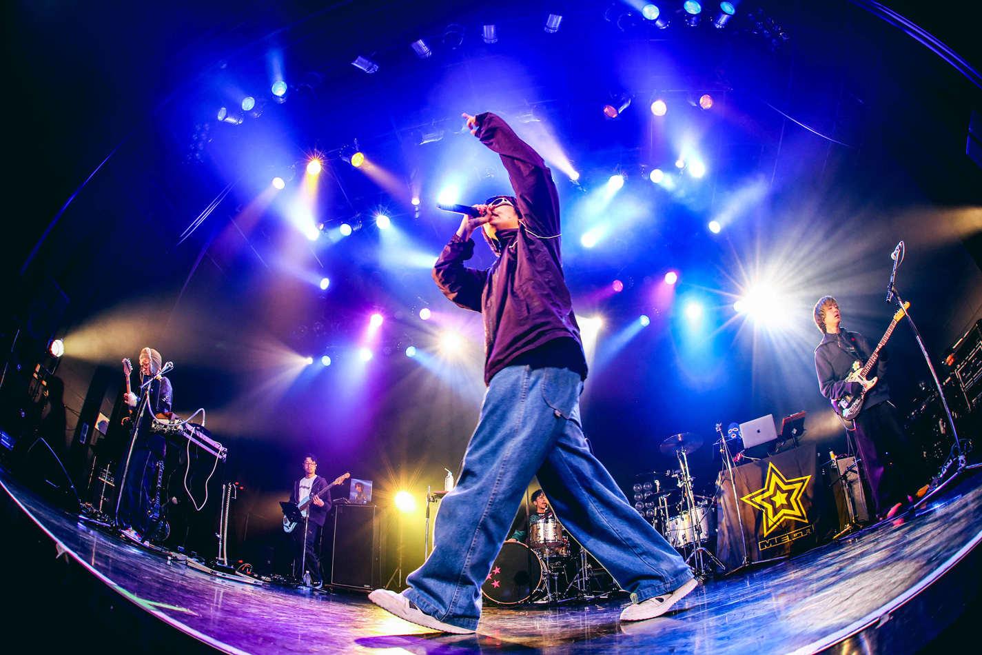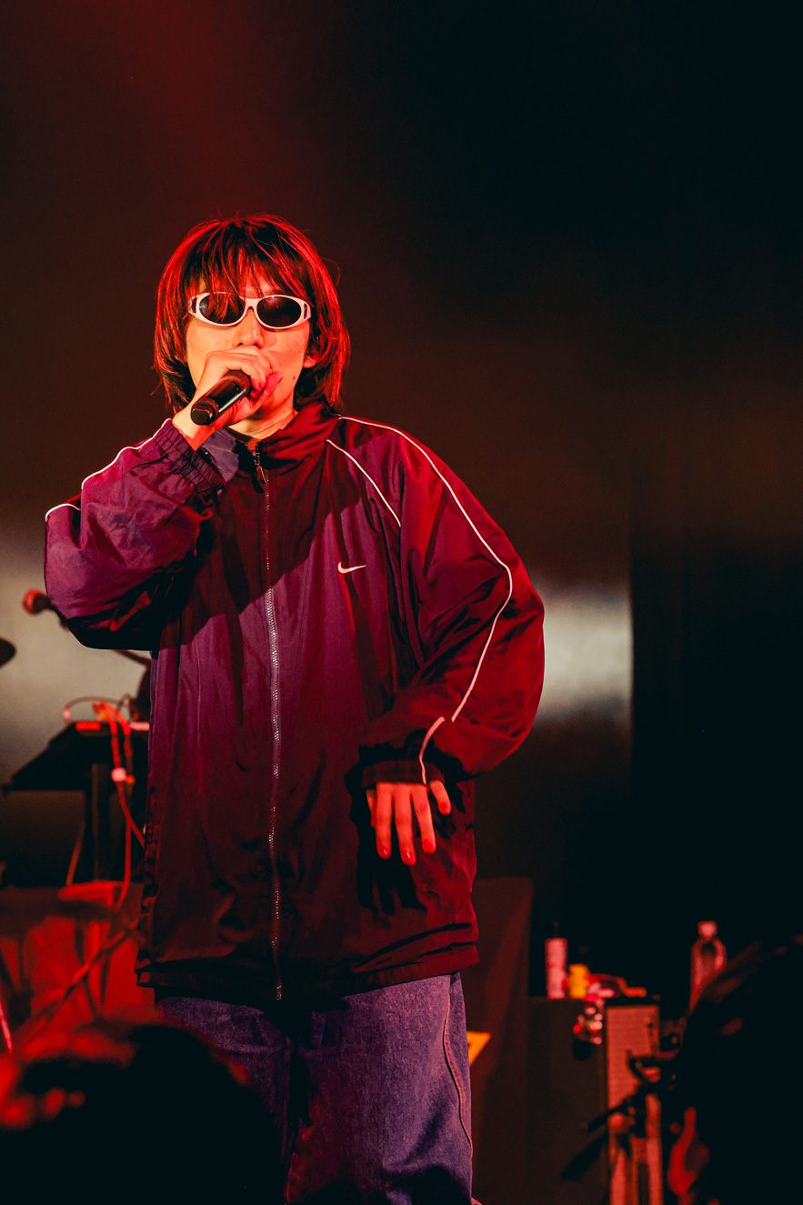 トリは1月1日に2nd ロックアルバム『2100年』をリリースしたばかりのMega Shinnosuke。サポートを迎えたロックな6人編成。ジングルが流れると勢いよくクラップが発生し、期待値の高さを感じさせた。Mega Shinnosukeのライブでは定番の「Thinking Boyz!!!」でゆらゆらとライブスタート。のっけからフロアに手が挙がる。さらにギターロックチューン「Sports」でヒートアップ。
