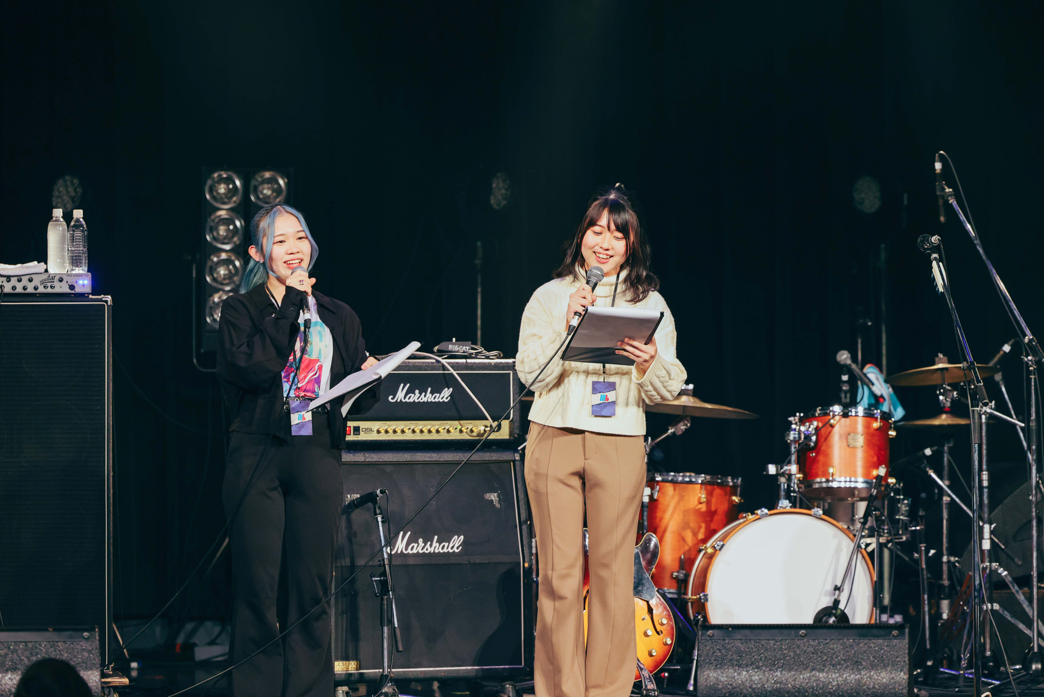 開演の時が近づくと、満席になった客席の後方に学生たちが集まりステージを見守っていた。定刻になり、オリジナルのジングル(こちらも学生作!)が鳴り響くと、ステージにMC担当のMB専攻生の2人が明るく登場。プロ顔負けの掛け合いも交えつつ、開催概要と注意事項を述べる。満員の客席を前にして、「うずうず、ドキドキが止まりません!」と興奮した様子の2人。声出しもOKとのことで、スタッフも巻き込んでクラップやウェーブ、ジャンプの練習を行い、ライブ前に会場を温めた。そしていよいよ、「今。ここから、スタート!」との宣言でイベントの幕が開けた。