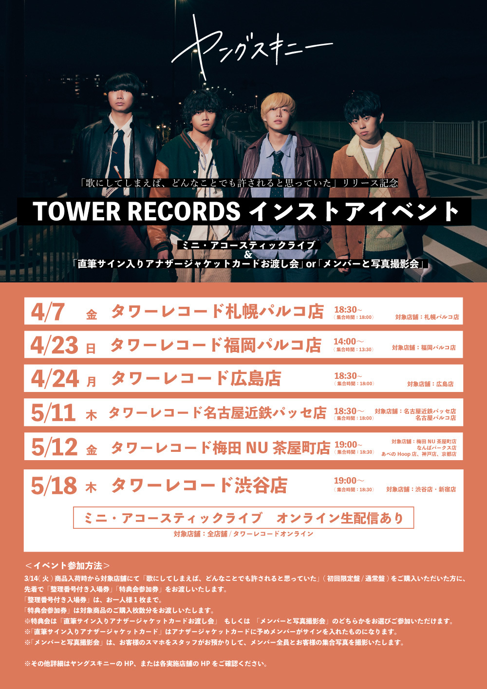 ミニ・アコースティックライブと特典会を予定しており、特典会は「特典会参加券」1枚につき「直筆サイン入りアナザージャケットカードお渡し会」 または 「メンバーと写真撮影会」への参加が選択できる。さらに、5月18日(木)19:00〜渋谷店で開催するミニ・アコースティックライブのオンライン生配信の実施も決定。期間内にタワーレコード渋谷店・新宿店を含む全店及びタワーレコードオンラインにて対象商品をご予約・ご購入頂いた方が視聴可能。「整理番号付き入場券」と「特典会参加券」、「オンライン視聴券」は先着順、上限があるのでお見逃しなく。