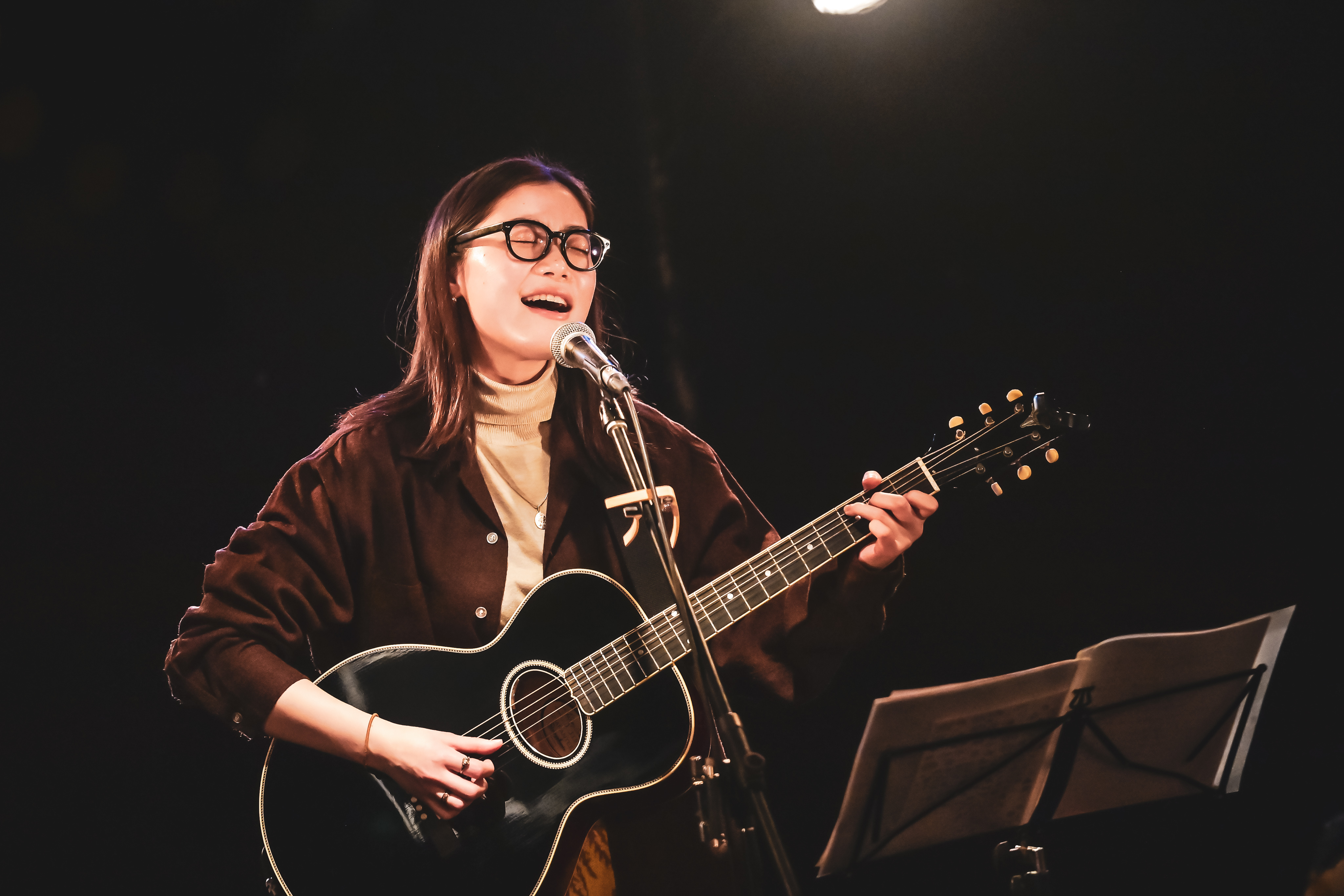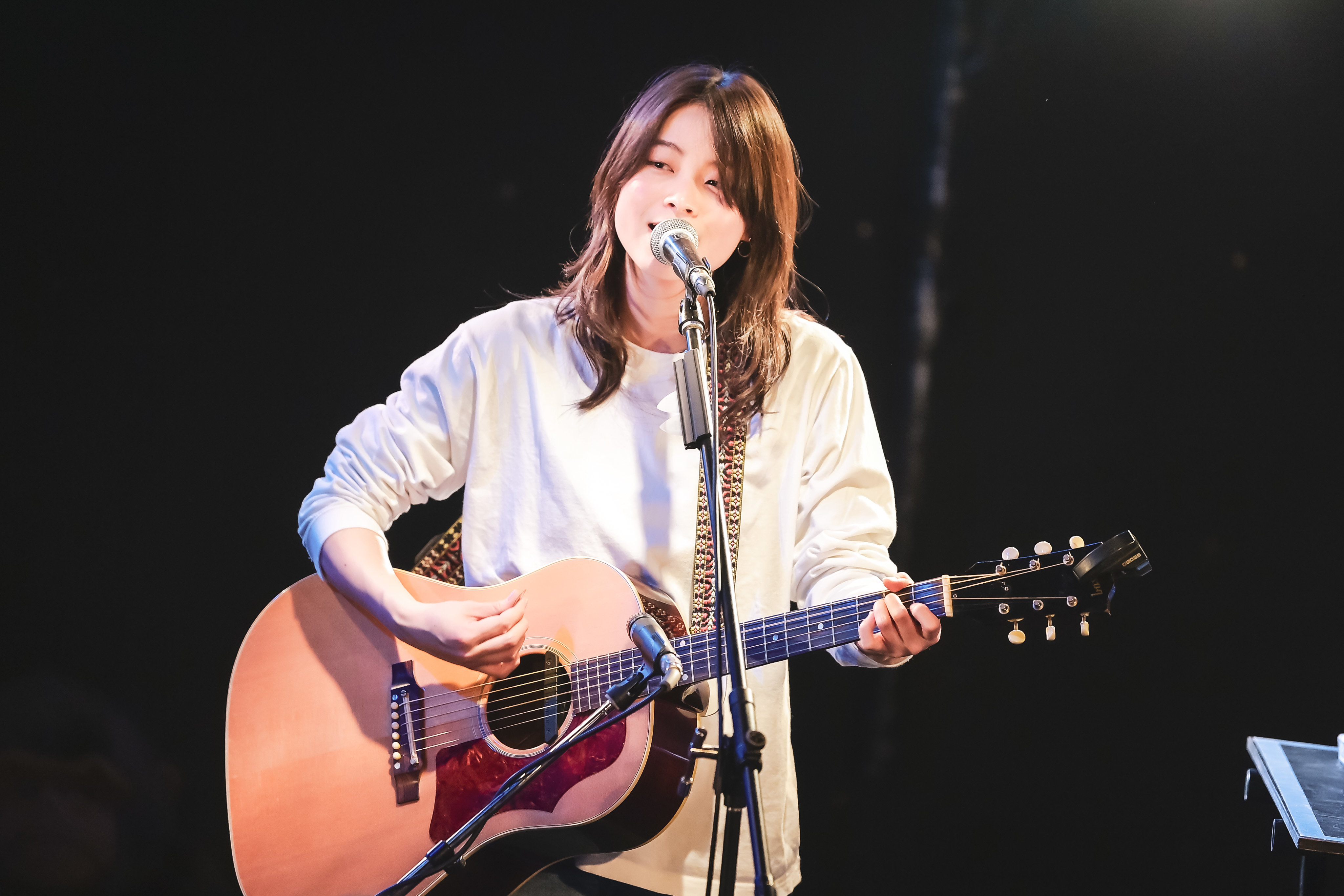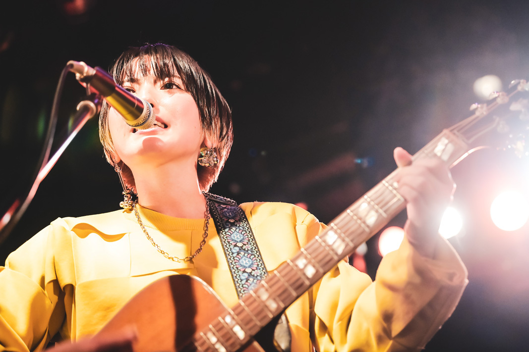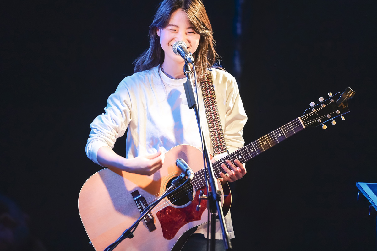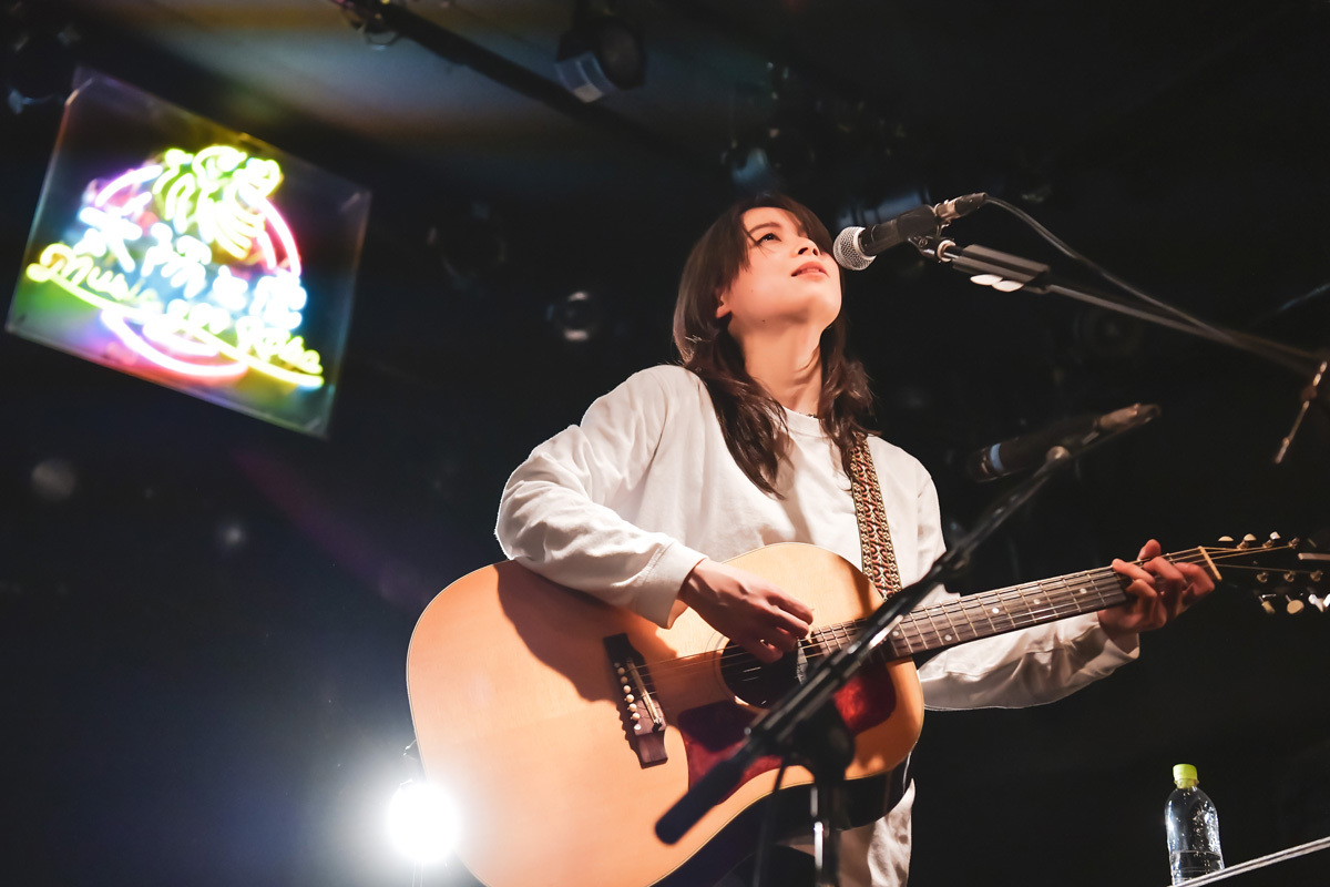 電車が頭上を走り抜ける中で高らかに1曲目を歌い終えた後、「神戸・太陽と虎に来るのは2回目、今日は私にとって年明け初ライブ、ツアー26本目です! ようこそ〜!」と歓迎すると、フロアからは大きな拍手が送られた。ゲストの2人について「優利香ちゃんは爽やかなギターをかき鳴らす姿と歌声が素敵でした。みらんちゃんは、生活が見える音楽だなと思って。三者三様の楽しいイベントになってとても嬉しいです」と柔らかい表情で述べる。