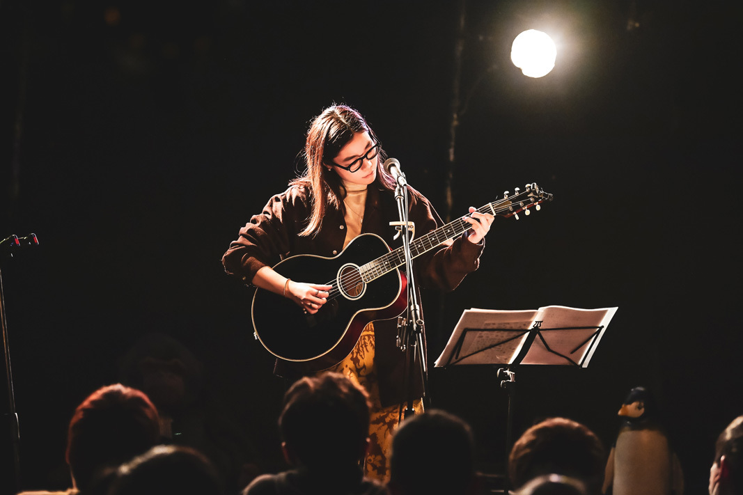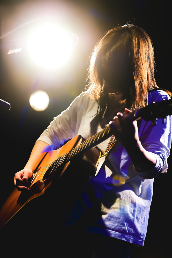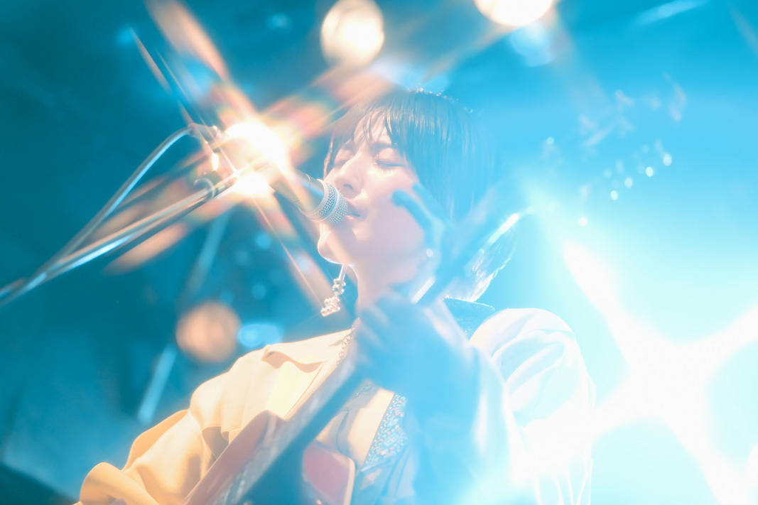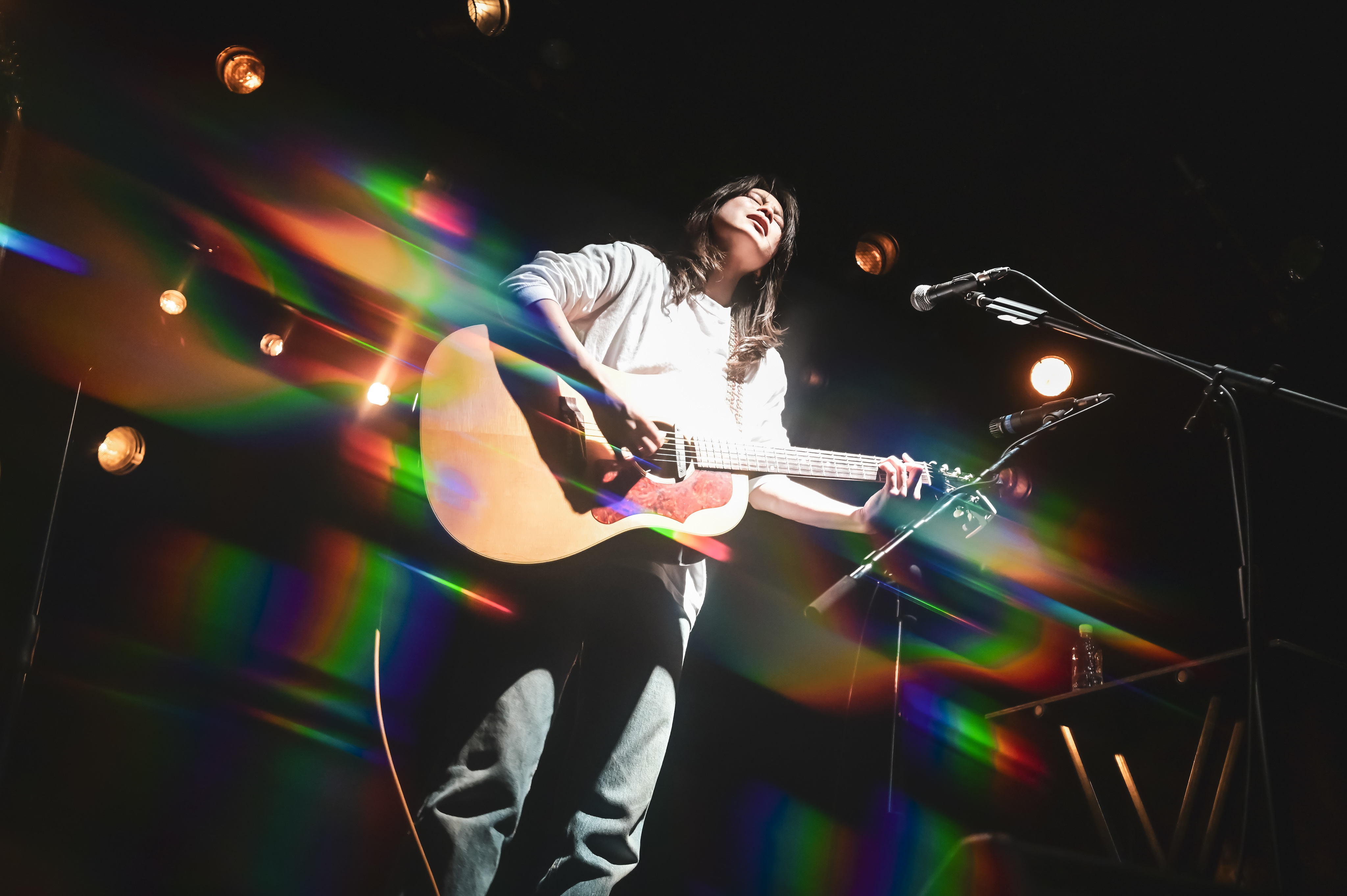 続いては、みらん。落ち着いた佇まいでステージに立つと、軽やかに丸く柔らかな歌声を響かせる。1曲目の「そこで僕はミルクを思い浮かべて」を披露した後は「意地と寂しさと」をプレイ。伸びやかで情緒的で、聴く者の情緒をふわっと撫でるような歌声は、心のひだに触れる気持ち良さがあり、強く惹きつけられる。