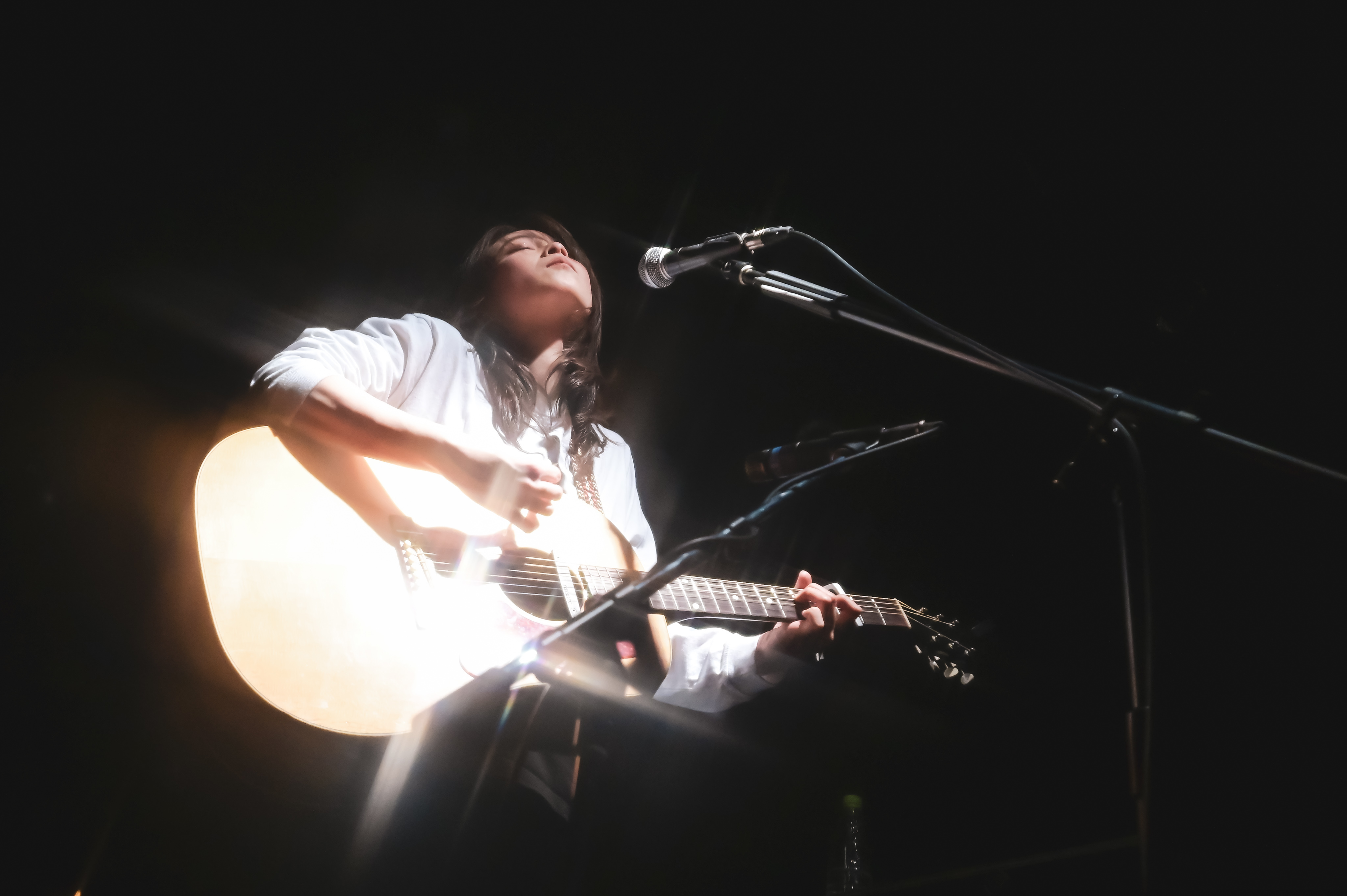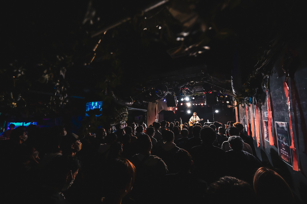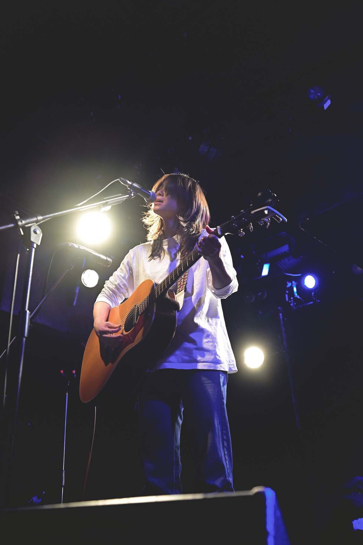 続いては、みらん。落ち着いた佇まいでステージに立つと、軽やかに丸く柔らかな歌声を響かせる。1曲目の「そこで僕はミルクを思い浮かべて」を披露した後は「意地と寂しさと」をプレイ。伸びやかで情緒的で、聴く者の情緒をふわっと撫でるような歌声は、心のひだに触れる気持ち良さがあり、強く惹きつけられる。