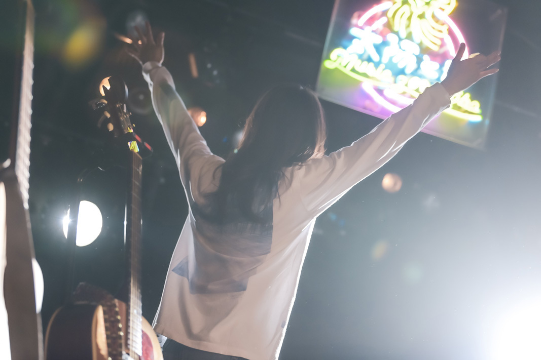 最初に登場したのは、地元・神戸出身の優利香。「神戸生まれ神戸育ち、シンガーソングライター・優利香がトップバッターをつとめさせていただきます!」と勢いよくアコギをかき鳴らし、「輝く未来へ」でライブスタート。清涼感のある歌声を響かせる姿は真っ直ぐで、満面の笑顔がキラキラと弾ける。MCでは柔らかい関西弁で「さっきヘアオイルつけたら手めっちゃ滑る、どうしよう(笑)」と天然っぽさも覗かせ、フロアを和ませる。