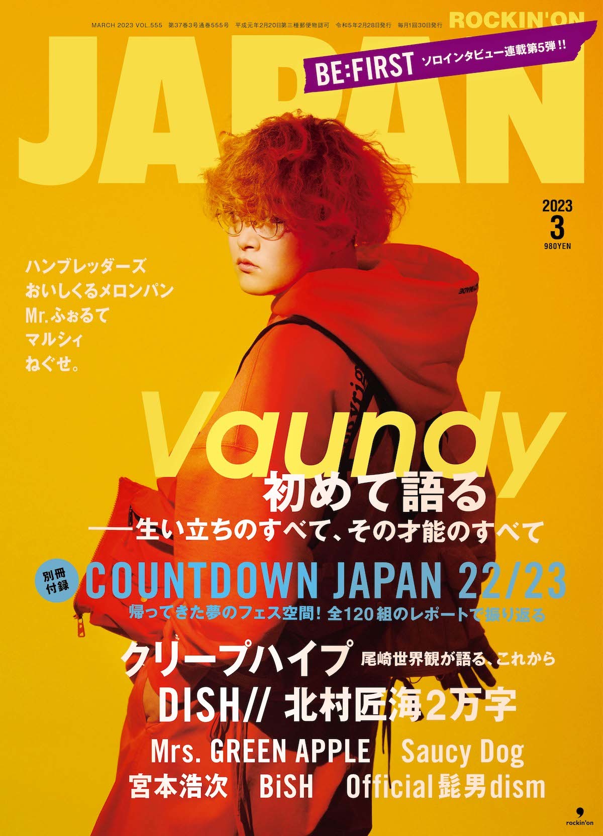 Vaundyが単独表紙を飾った『ROCKIN’ON JAPAN』が(2023年3月号)が本日・1月30日に発売。Vaundyが雑誌の単独表紙を飾るのは今回が初となる。