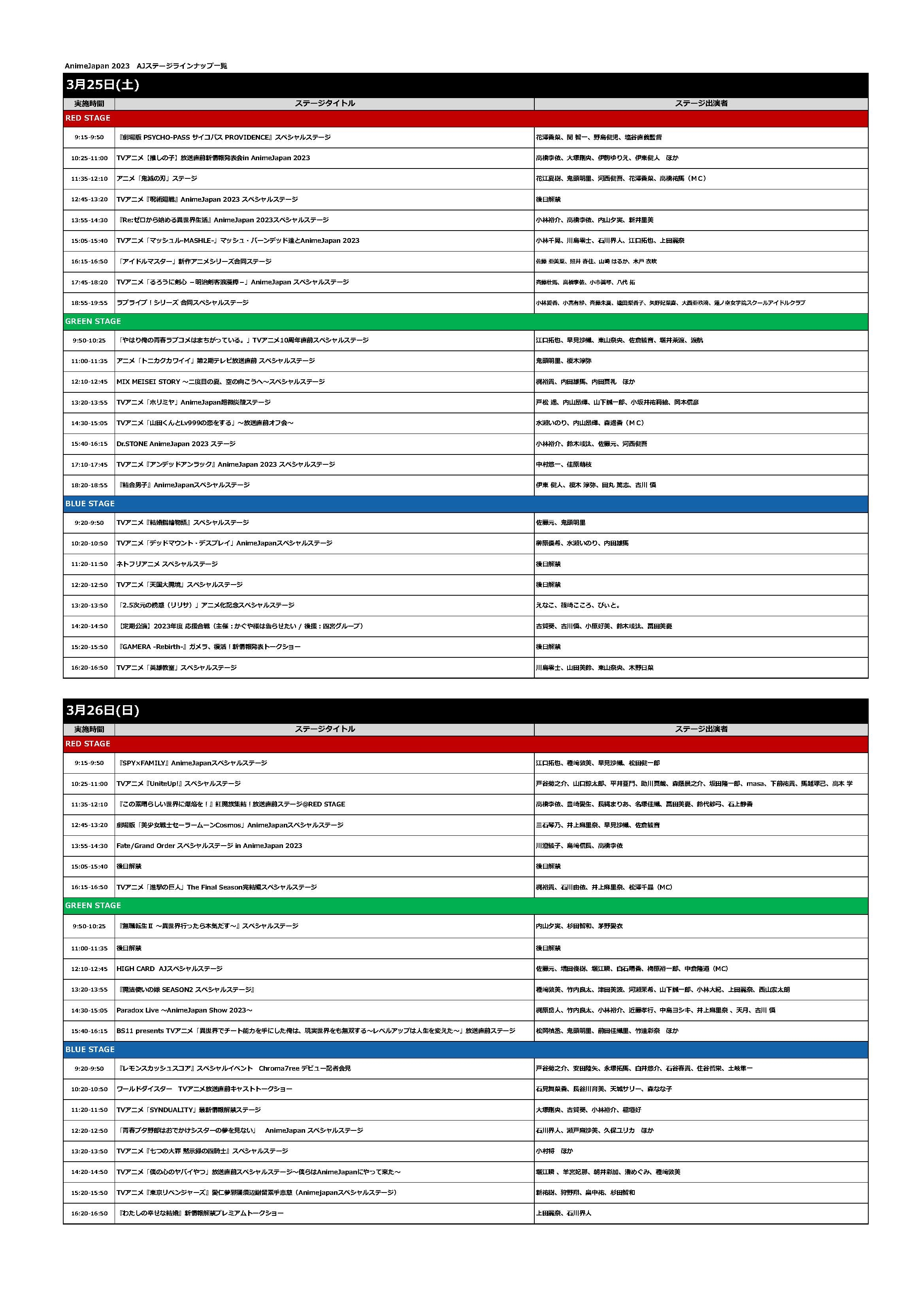『AnimeJapan 2023』は2014年から毎年3月下旬に行われている総合アニメーションイベント。今年もRED STAGE、GREEN STAGE、BLUE STAGEの3つのステージで、ヒット作から今話題の作品や新作出演者によるトークや歌唱などが繰り広げられる。詳細は下記の表と公式サイトで確認してほしい。