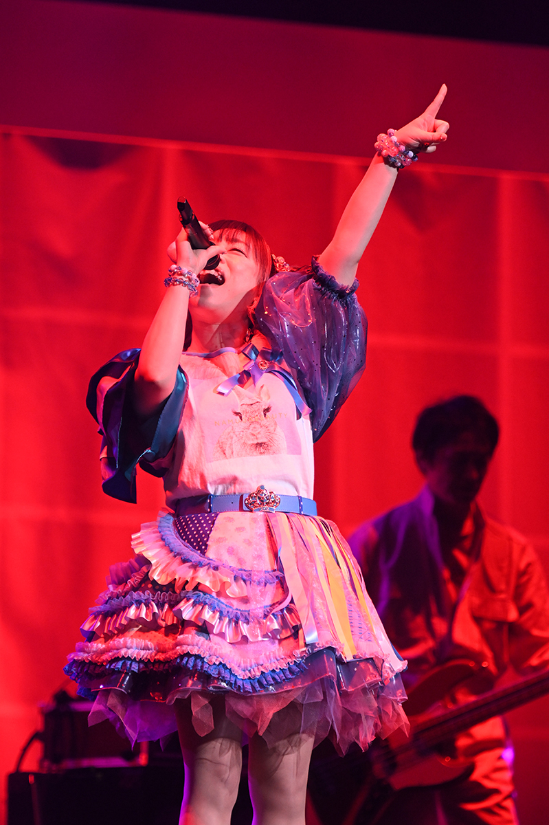 3 日目は、なんと本日の出演者の中ではベテランの部類に入る KOTOKO がトップバッターで登場。しかも 近年ネットを中心に人気を集める最新型の電波ソング「INTERNET OVERDOSE」を 1 曲目から放ち、 会場を早くも熱狂の渦に。さらに 2022 年リリースの電波ソングアルバム『すぅぃ~とさいくろん-☆いぇいっ ☆-』収録の「タコですよ︖」を歌うと、そこから往年の名曲を織り交ぜた電波ソングメドレーに突入。「巫女 みこナース・愛のテーマ -こっとんちゃれんじばーじょん-」「めぃぷるシロップ」「きゅるるん Kiss でジャンボ♪♪」 「ねぇ、…しようよ!」「Princess Bride!」「↑青春ロケット↑」の 6 曲を立て続け、2000 年代当時をリ アルに追っていたファンは感涙の嵐だ。ラストは「さくらんぼキッス ~爆発だも~ん~[2022mix]」で会場 の熱気をまさに“爆発”させてステージを終えた。
