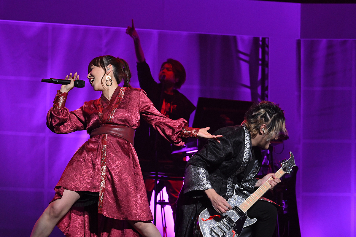 4 組目に登場したのは、 ボーカリストの Who-ya を中心としたクリエイターズユニット、 Who-ya Extended 。“リスアニ!LIVE”には今回が初参加となる。まずは TV アニメ『PSYCHO-PASS 3』の OP テーマ「Q-vism」で激情的かつ鮮烈なステージを繰り広げると、続けて劇場アニメ『PSYCHO-PASS サ イコパス 3 FIRST INSPECTOR』主題歌「Synthetic Sympathy」を披露し、サイバーなサウンド感 も込みで作品の世界観を表現する。そこからダンサブルかつ疾走感のある「A Shout Of Triumph」 (TV アニメ『ビルディバイド -#FFFFFF-』ED テーマ)でさらに加速していき、ラストは TV アニメ『呪術 廻戦』の OP テーマとして話題を呼んだ「VIVID VICE」を領域展開してラウドに締め括り。武道館のオー ディエンスに強烈な印象を焼き付けた。