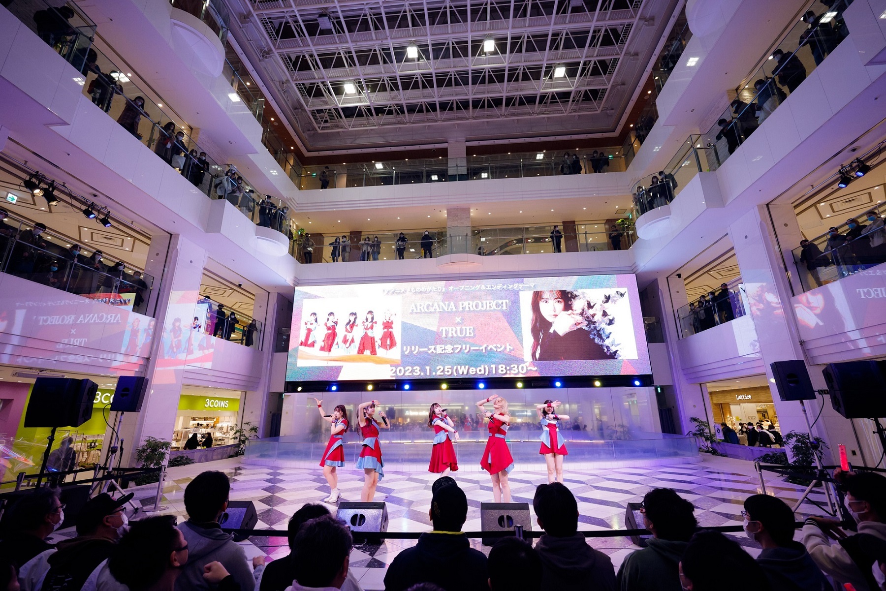 イベントの観覧目的で集まった人たちはもちろん、たまたま買い物に来ていた客も行きかう東京・池袋サンシャインの噴水広場のス テージ。SEと共に噴水が高く噴きあがると盛大な拍手の音が響く中、ARCANA PROJECTが登場。まずはオーディエンスにあいさ つ代わりの一曲「とめどない潮騒に僕たちは何を歌うだろうか」が披露される。TVアニメ『白い砂のアクアトープ』の2クール目オープニ ングテーマを、笑顔を抑えきれないと言わんばかりの笑みと共に歌うARCANA PROJECTの5人。ステージから視線をあげると、 2階、3階、4階と彼女たちを見下ろすように観客が楽曲に聴き入っている。そんなオーディエンスに手を振りながら跳ねる歌声を 響かせると、「一緒に楽しんでいきましょー!」の声に続けて、TVアニメ『もののがたり』オープニングテーマ「恋衣」が鳴り出す。