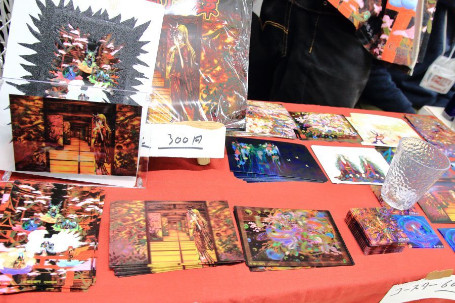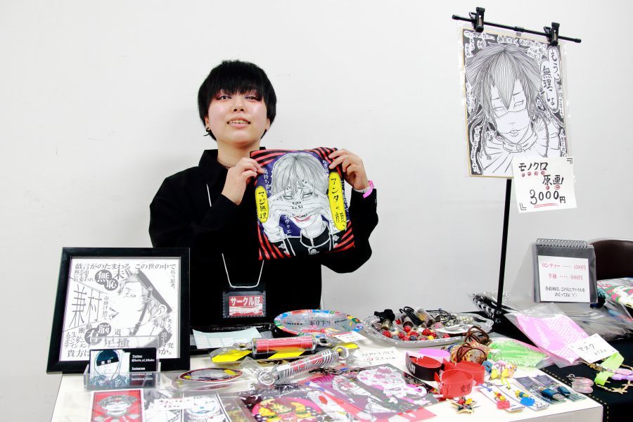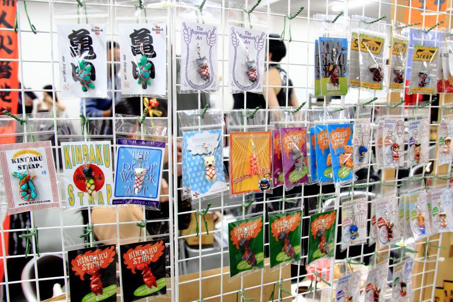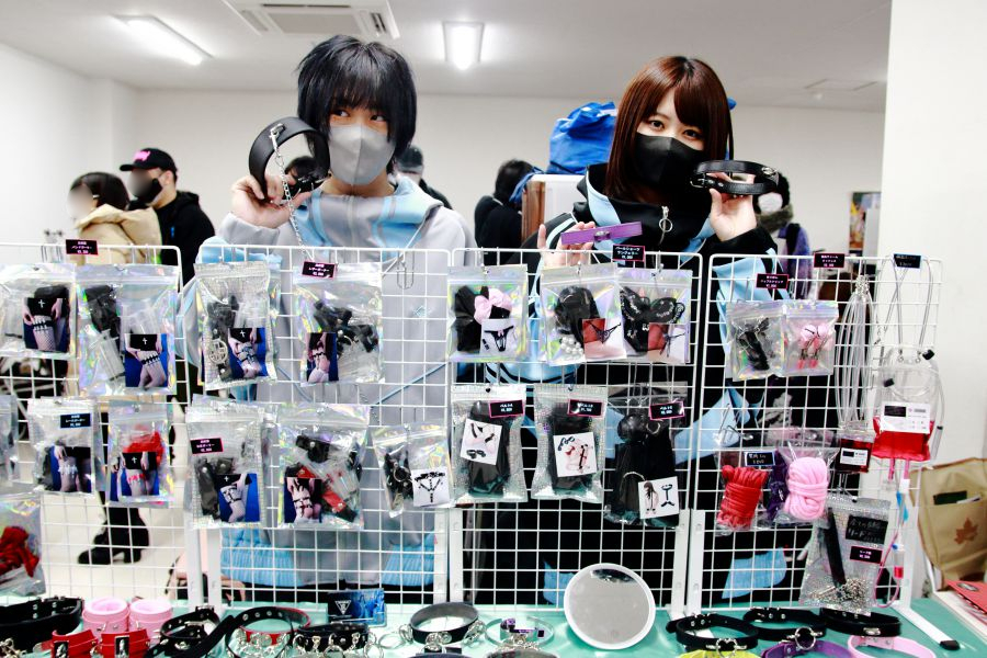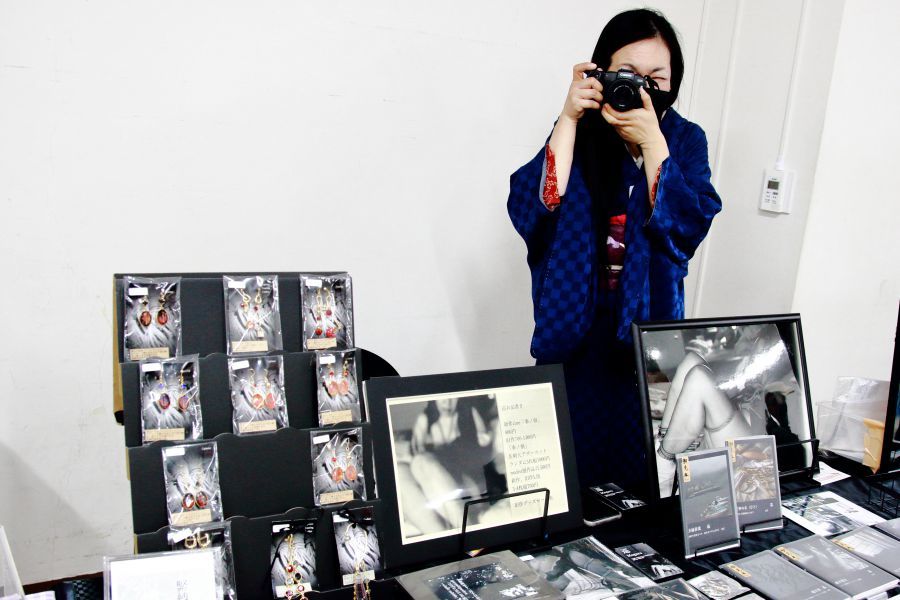 関西を活動拠点にする巡は、新作の写真作品と「体液の滴り」をモチーフにした装身具を販売。北海道札幌で活動する鞭匠初代桃太郎は「イベントに参加したいために出展しました」と初出展に意気込む。桃鞭.comの鞭や口枷が好評で、鞭20本のうち18本が前半で売れたという。