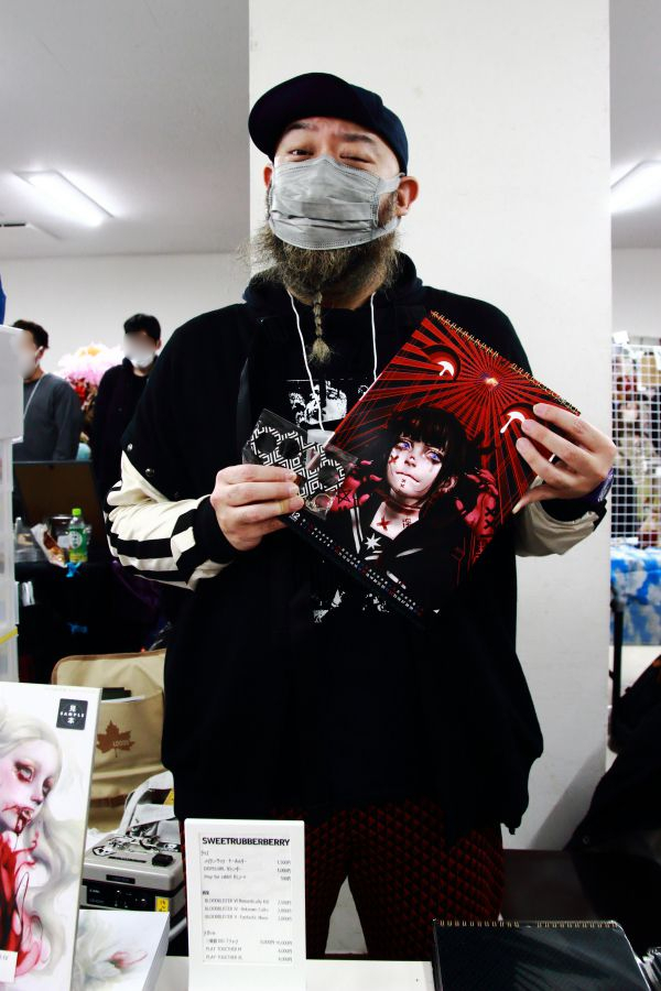 SWEETRUBBERBERRYでは、オカルトと血をモチーフとしたイラスト満載のDISPELGIRLカレンダーなどに加えて、ジョークグッズのメリケンサックキーホルダーも販売。GENkは「こういうグッズもいっぱい作りたいです」と今後の方向性を述べた。