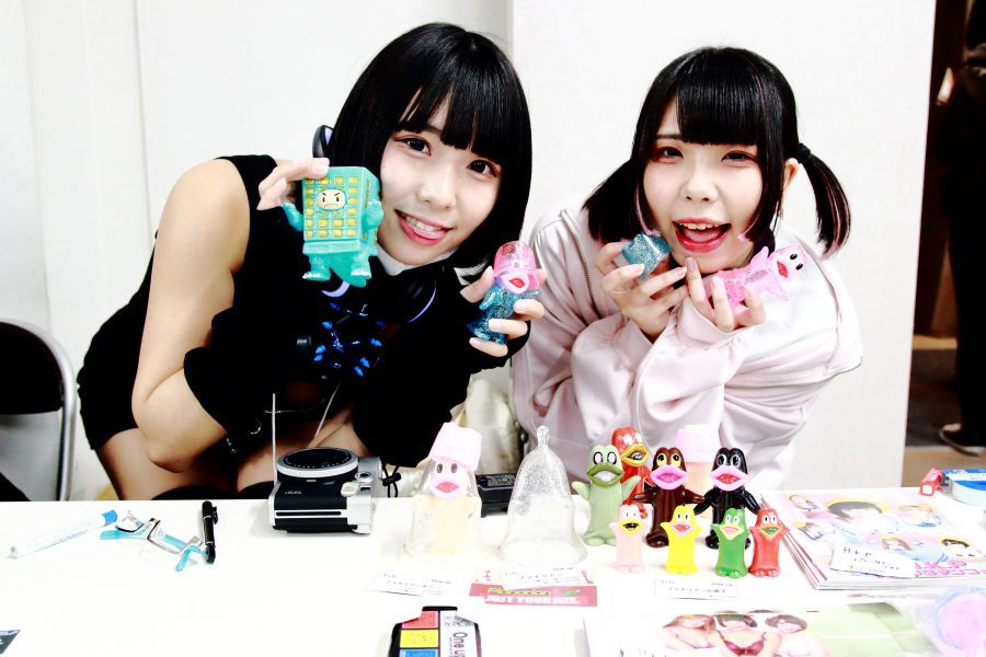SUNGUTS FACTORYは「ソフビ×アイドル」コラボを実現。地下アイドルグループ「必殺エモモモモ7」のゆうかりんとのあぴえんは「コラボしていただけて本当に嬉しいです。いろんな層の人に知ってもらいたいです」とフェチフェス初参加の感想を述べた。