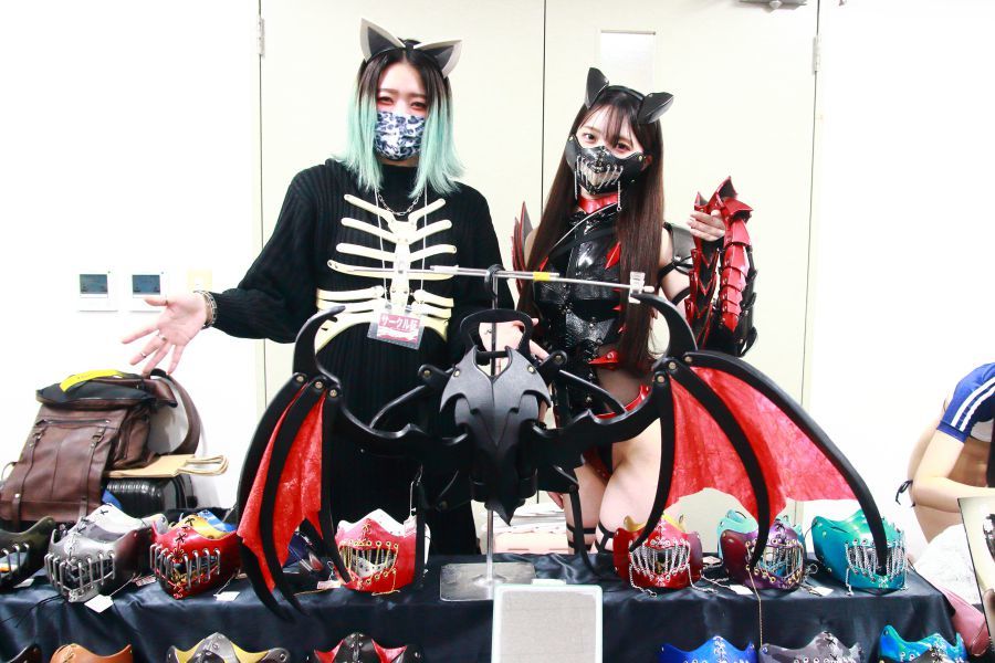 マスクなどを販売する大美屋工房では肋骨アーマーと羽根を試着できた。「お客さんが欲しいものの予想を立てて制作しています」と語るしげは、一人一人の要望に合わせた特注アーマーのオーダーも常時受け付けている。