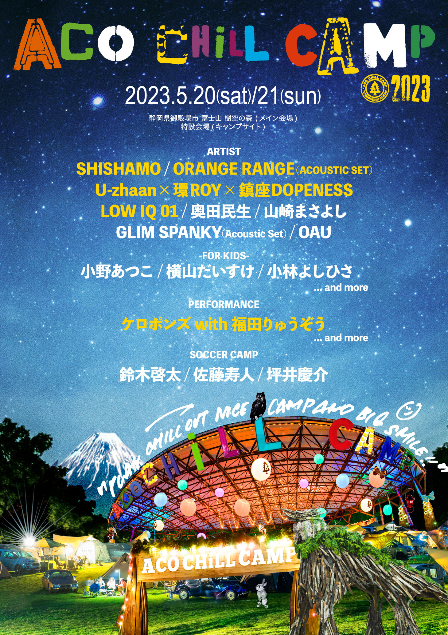 5月20日(土)と5月21日(日)の二日間、静岡県御殿場市「富士山樹空の森」にて行われる『ACO CHiLL CAMP 2023 〜アソブ、オドロク、フジサン、キャンプ。〜』の第二弾となる出演者が発表された。