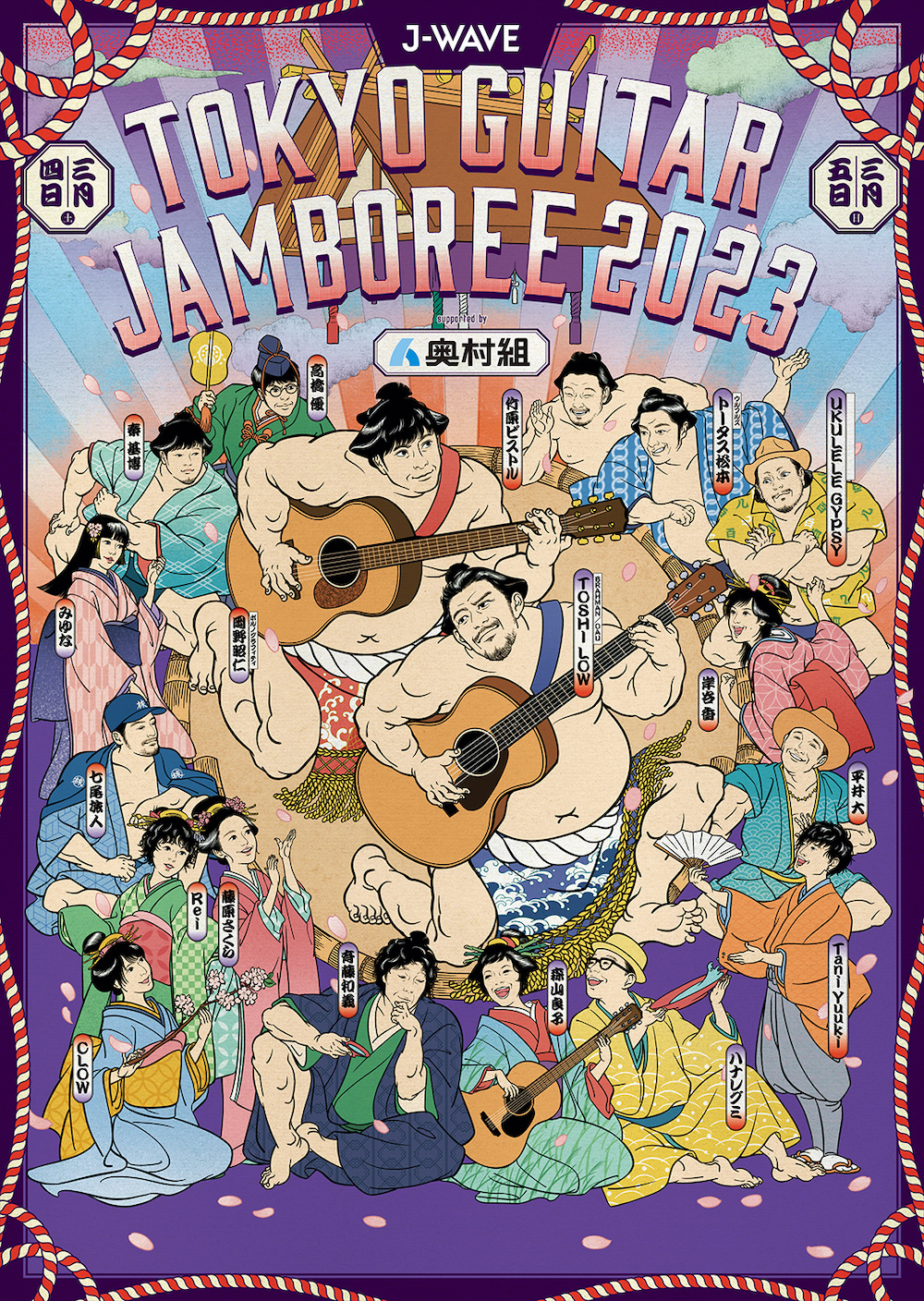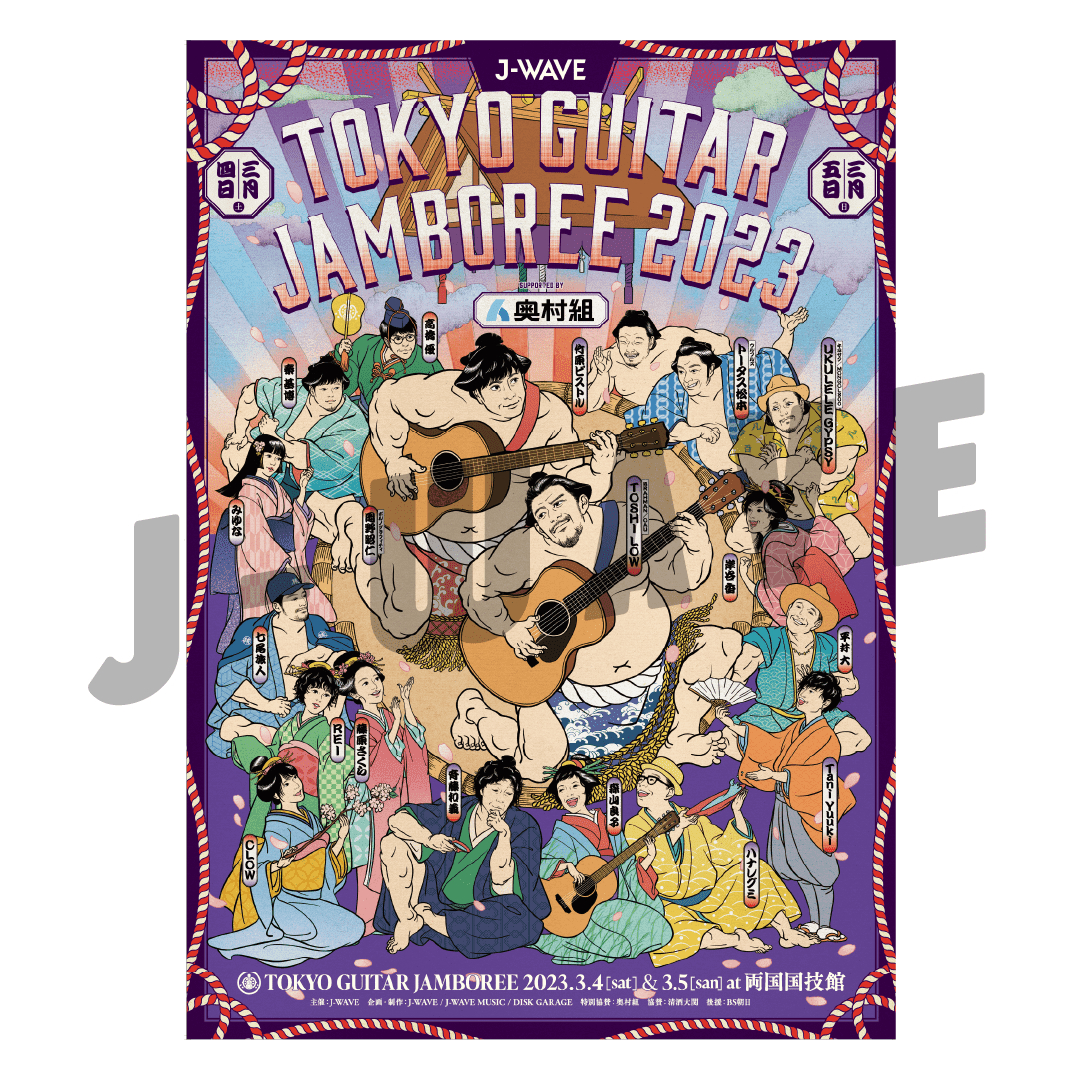 ラジオ局J-WAVE(81.3FM)が2023年3月4日(土)・5日(日)の2日間、アーティストがギター弾き語りで共演するライブイベント『J-WAVE TOKYO GUITAR JAMBOREE 2023 supported by 奥村組』(以下、ギタージャンボリー)を両国国技館で開催する。今回、『ギタージャンボリー』恒例の公式イラストが解禁され、公式グッズ「OMIYAGE」の事前予約・会場受取先行販売が開始した。