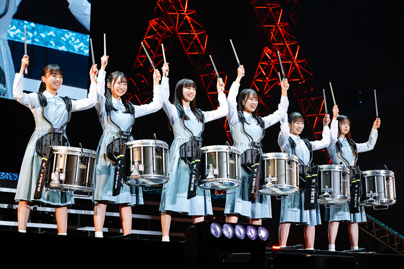 VTRでけやき坂46時代のパフォーマンスの模様が紹介された後、ドラムを抱えた石塚、小西、清水、竹内、平尾、藤嶌が登場。ソロ演奏やコンビネーション技など、さまざまな見せ場を作って観客を楽しませた。続いて岸、正源司、平岡、宮地、山下、渡辺がフラッグとライフルを使ったカラーガードを披露。先ほどは特技のバトンを回していた宮地は、ライフルを空中に投げて見事にキャッチした。最後は、12人全員でダンストラックを踊る。昨年12月に行われた「ひなくり2022」でもダンストラックを踊っているが、今回はフォーメーションダンスを軸にした構成で、四期生のチームワークを見せた。