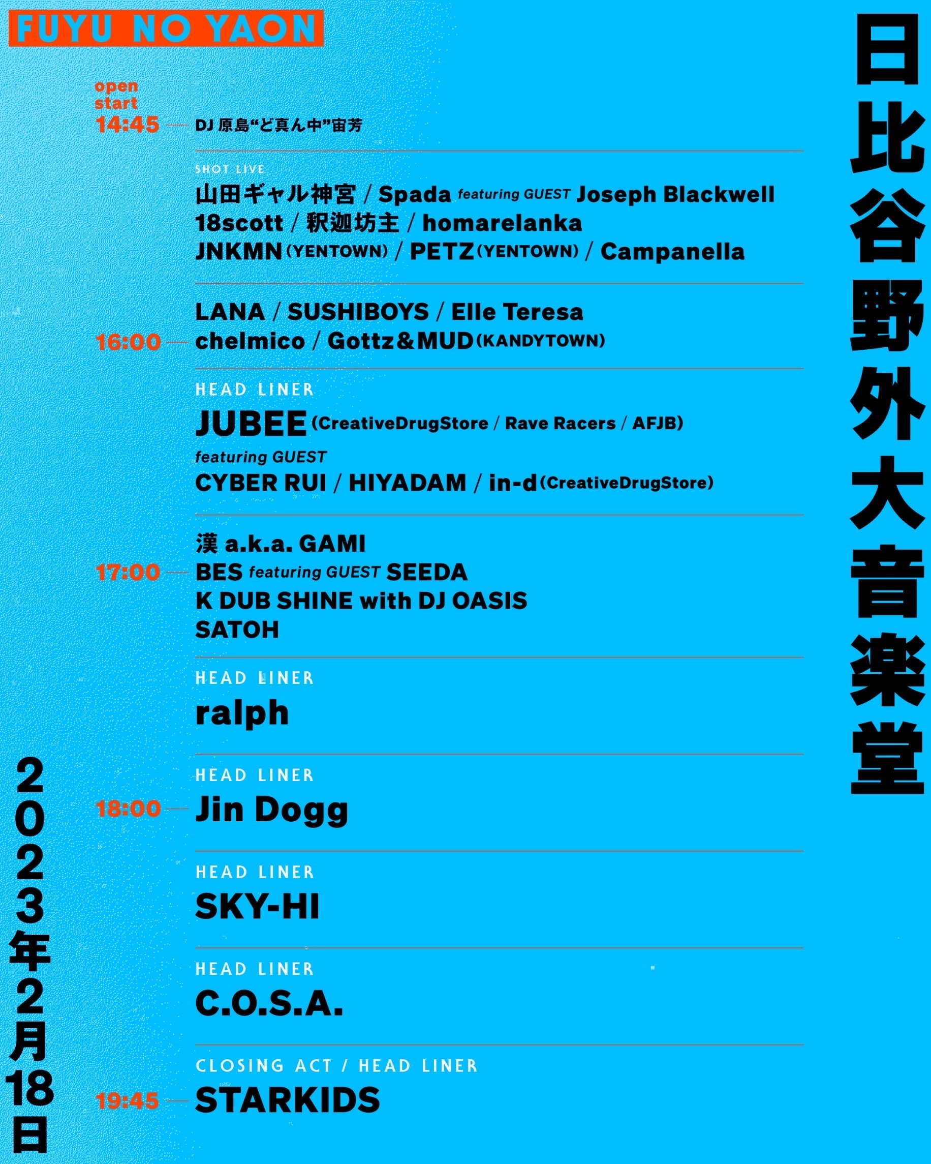 2月18日(土)に日比谷野外大音楽堂にて開催されるヒップホップフェス『FUYU NO YAON』タイムテーブルが発表された。
