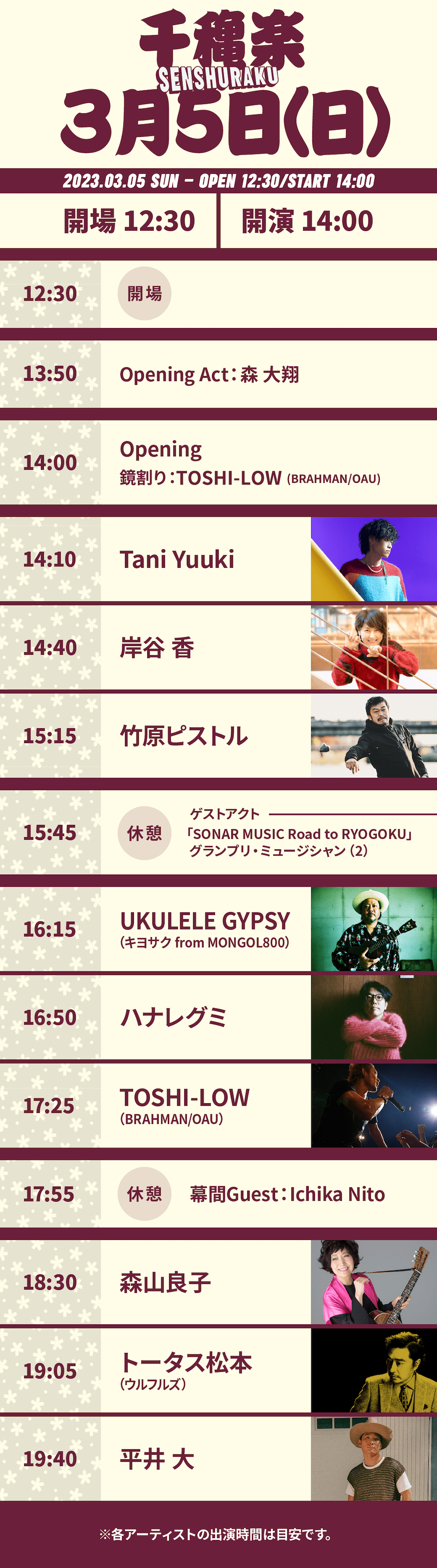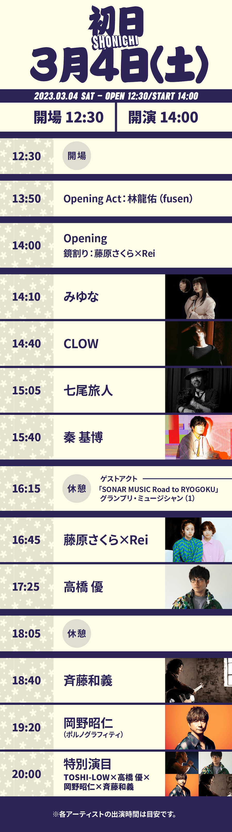 初日・3月4日(土)のトップバッターはみゆな。ラストは特別演目として、TOSHI-LOW×高橋 優×岡野昭仁×斉藤和義の4組が弾き語りパフォーマンス。この日だけのスペシャル・セッションを披露する。TOSHI-LOWは既に発表されている3月5日(日)の出演とあわせて、ギタージャンボリー史上初の両日出演となる。千穐楽・3月5日(日)はTani Yuukiから始まり、平井 大が2日間の大トリを飾る。