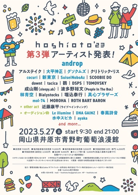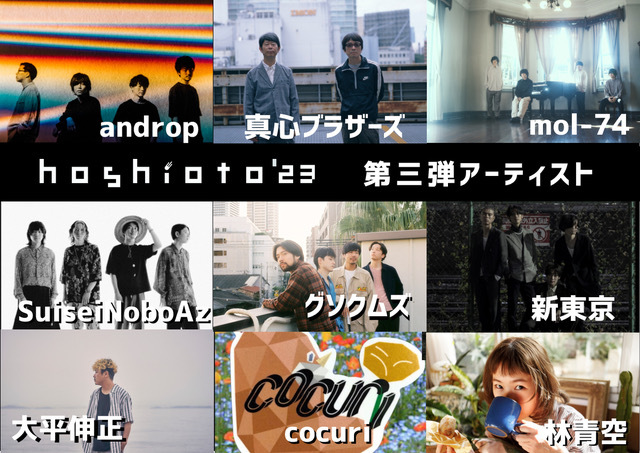 第3弾アーティストとして発表されたのは「androp」「大平伸正」「グソクムズ」「cocuri」「新東京」「SuiseiNoboAz」「林青空」「真心ブラザーズ」「mol-74」以上の9組。また、今年のhoshiotoのヘッドライナーは初出演のandropに決定した。