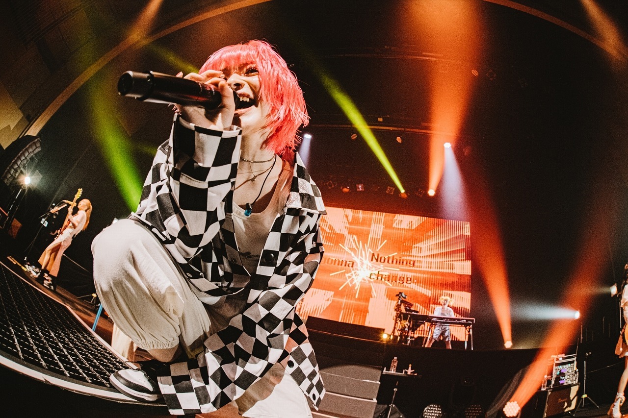 続いてアコースティックセットで心疲れた人に“あなたはそのままでいいんだよ”と寄り添う新曲「Where you belong」、さらにオレオがメインヴォーカルをとる「夢言実行」をしっとり聴かせると、“プリティーエイリアン”ことTOMO-ZOのソロ曲「マジックアンブレラガール」につなげる。屈託のない笑顔でキュートなナンバーを歌うTOMO-ZOだが、ギタープレイではテクが爆裂。この愛くるしいギャップはGacharic Spinのライブの醍醐味のひとつだろう。そして、「シャキシャキして!!」「赤裸ライアー」のシングル曲で再び場内を盛り上げ、楽器隊が牙を剥くサウンドの中で“こんな世界だからこそ此処に立ち続けて歌おう”と威風堂々と歌い上げるバンドの意識表明とも言える「I wish I」で前半戦が締められた。