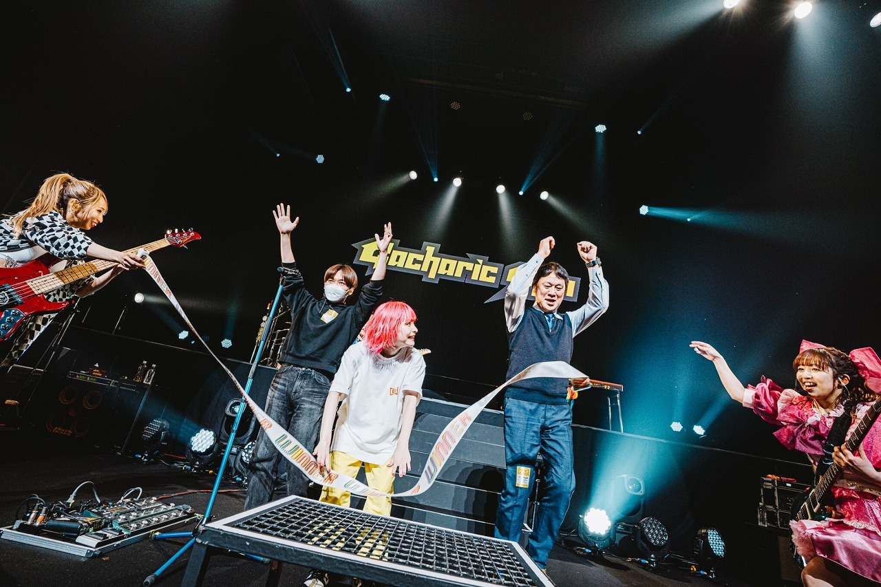 アンコールの幕開けは「WINNER」。その場で腿上げを強要する“5分間一本勝負”のライブ定番曲で再び客席にボルテージを上げる中、舞台袖から移籍先である日本クラウンの片岡社長とクラウンレコードの古宮ディレクターをステージに引き入れて、Gacharic Spinを迎えたからには運命共同体とばかりに一緒に試練の腿上げ。曲終わりには片岡社長が息を切らせながらも「クラウンに移って、また新たなステージに行っていただきたい」と語りつつ、「僕的には大きな玉ねぎのある下の会場でライブを観て、みなさんと喜びを分かち合いたい」という切望と話す場面も。さらに、その流れでKOGAの口から重大発表が。バンドが2024年10月に15周年を迎えるということで、“Limit Breaker~結成15周年に向けて~”をタイトルに、11月18日に日比谷野外大音楽堂でライブを開催することを発表すると、「もうひとつGacharic Spinからお知らせがあるんです!」と本公演と同じく“New Revolution”と題したツアーとコロナ禍等で中断していた47都道府県ツアー「ROCKET SPIRITS」のリスタートも告知された。
