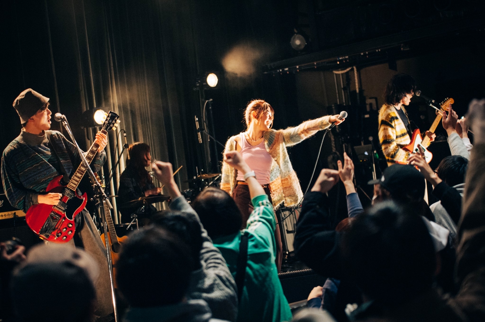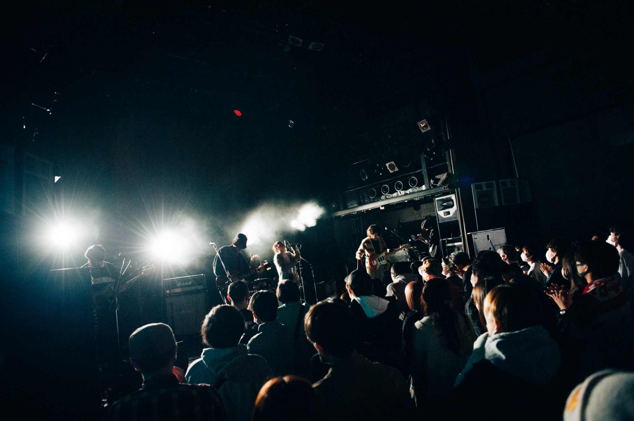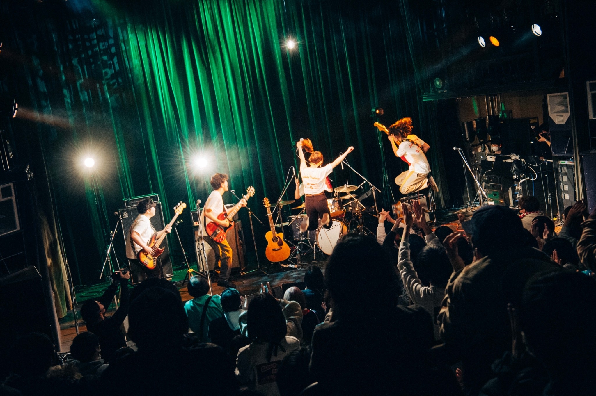 「Dodgeball Love」以降はたまみがアコギを携えて歌う曲が加わり、アンサンブルにより深みが増す。Kanaのソングオリエンテッドなドラムに合わせてその声がどんどんピュアに弾けたりと、「Timeless Melody」ではバンドの美しい相互作用が見られる瞬間も。序盤の4曲を一気に駆け抜けた時点で、すでにオーディエンスは大盛り上がりだ。