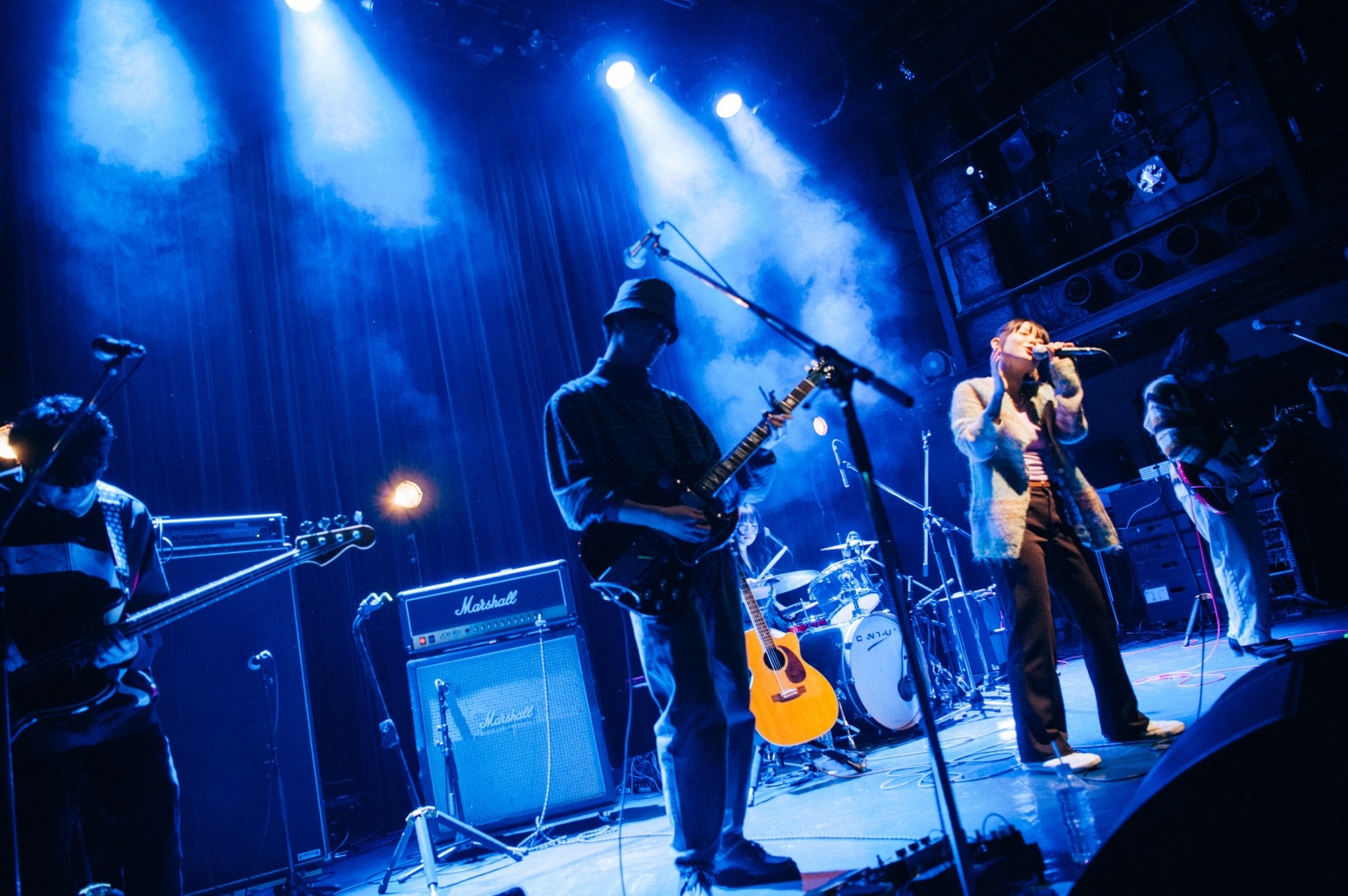 そして、双子の藤島裕斗(Gu)と藤島雅斗(Gu&Vo)、幼なじみのたまみ(Vo)とKana(Dr)からなるSubway Daydreamは、サポートにtakumi(Ba)を迎えた編成で臨む。裕斗が鳴らすフィードバックノイズで始まったニューアルバム『RIDE』のオープナー「Skyline」を皮切りに、男女ツインボーカルによってブライトな爽快感を放つグランジポップ「Freeway」など、1st EP『BORN』の楽曲も織り交ぜながら、5人は80~90年代のインディ/オルタナティブロックを素直に吸収したサウンド、魔法のような輝きを湛えたグッドメロディといった自分たちの持ち味を順調に発揮。
