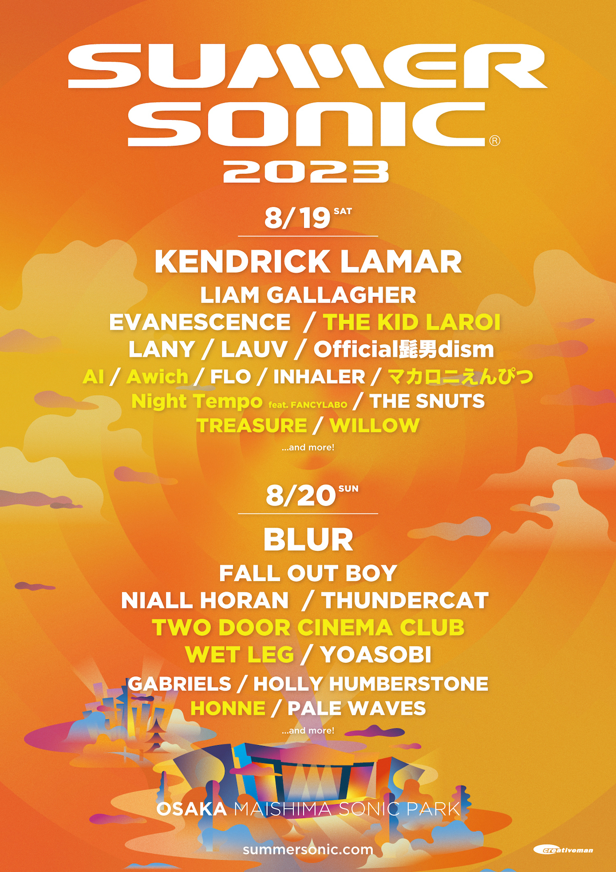 2023年8月19日(土)・20日(日)にZOZOマリンスタジアム&幕張メッセ、8月19日(土)・20日(日)に舞洲SONIC PARK(舞洲スポーツアイランド)にて開催される『SUMMER SONIC 2023』の追加アーティスト、日程別のラインナップが発表された。