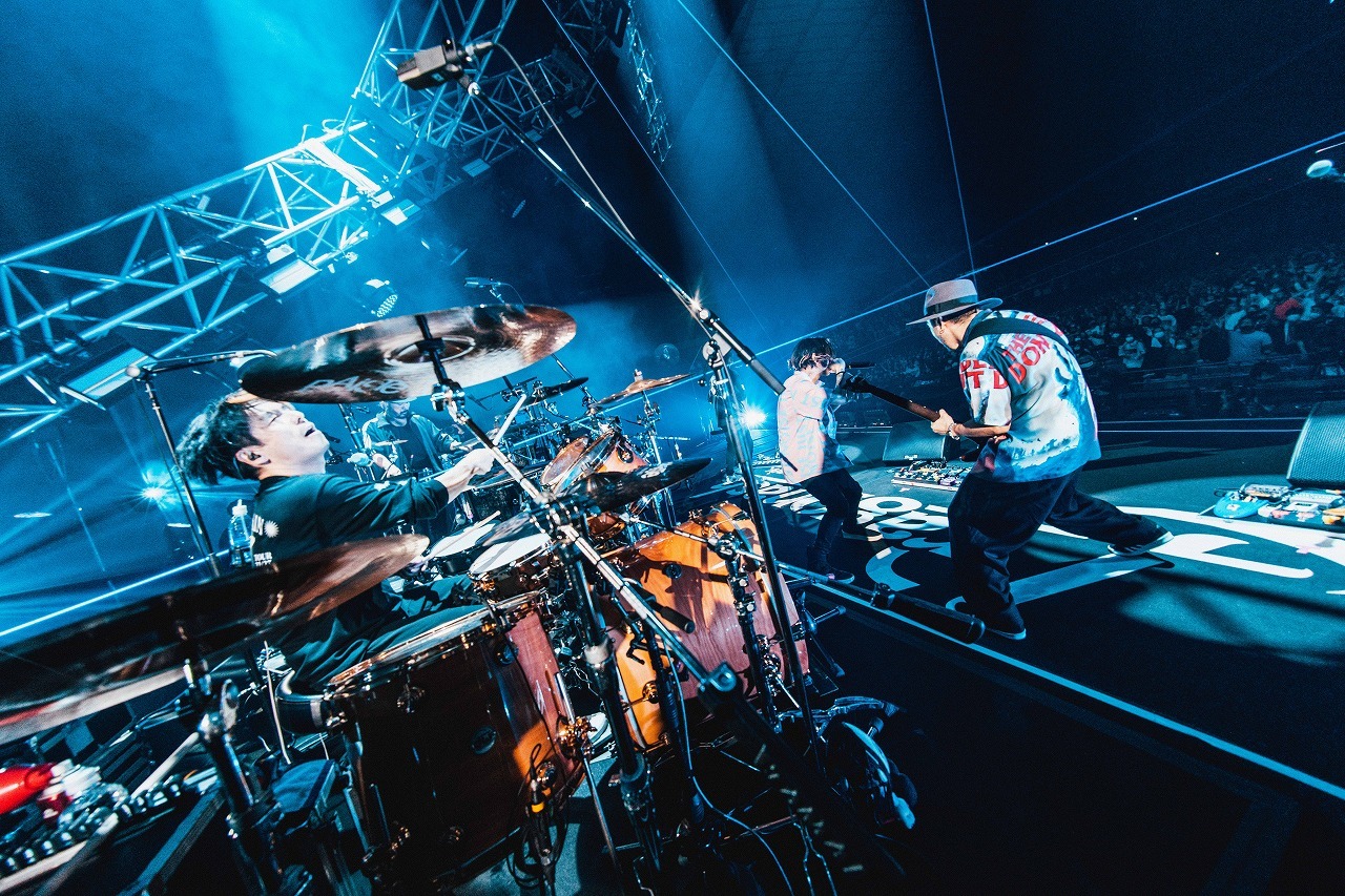 ミクスチャーロックにラテンのテイストを加えた「Crush the window」「Ivory」といった曲が25年間におけるバンドの音楽性の進化・深化を今一度印象づけながら、5人は序盤の盛り上がりをさらに大きなものにしていく。そして、25周年を祝うために駆けつけたスケボーキングのSHIGEO、SHUNとKjがラップを掛け合い、会場を揺らした「Episode 4」で中盤の盛り上がりは頂点に! そして、その熱狂から一転、バラードともチルなナンバーとも言える「静かな日々の階段を」と繋げ、バンドが持つ振り幅をダイナミックに見せつけたのだから心憎い。