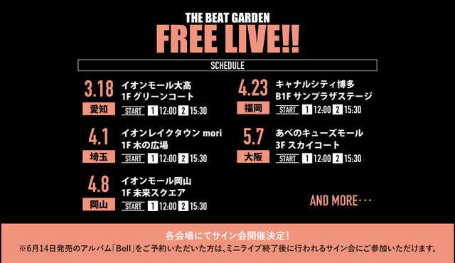 昨年で結成10周年を迎え、今年の6月14日(水)に通算4枚目となるフルアルバム『Bell』のリリースを発表したばかりのTHE BEAT GARDEN。同アルバムのリリースを記念したリリースイベントの詳細が発表された。