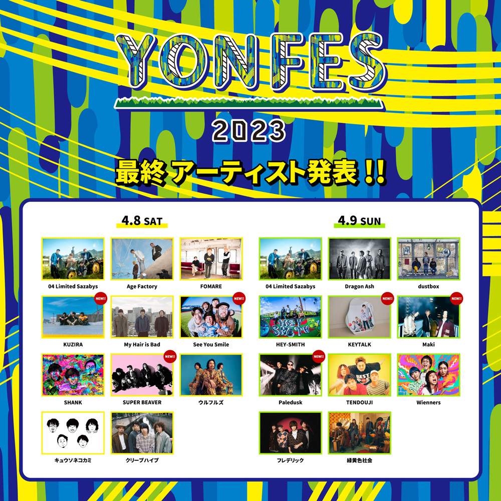 2023年4月8日(土)・9日(日)愛知県・モリコロパーク(愛・地球博記念公園)にて行われる野外フェス『YON FES 2023』の最終出演アーティストが発表された。