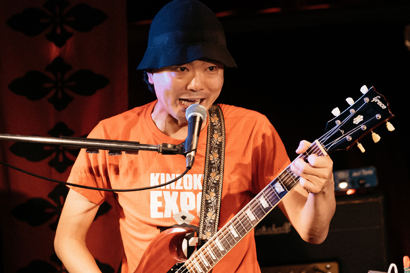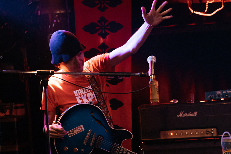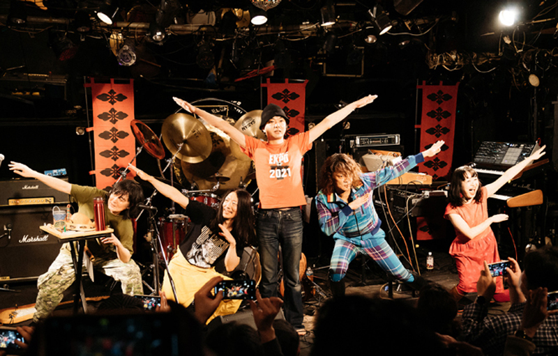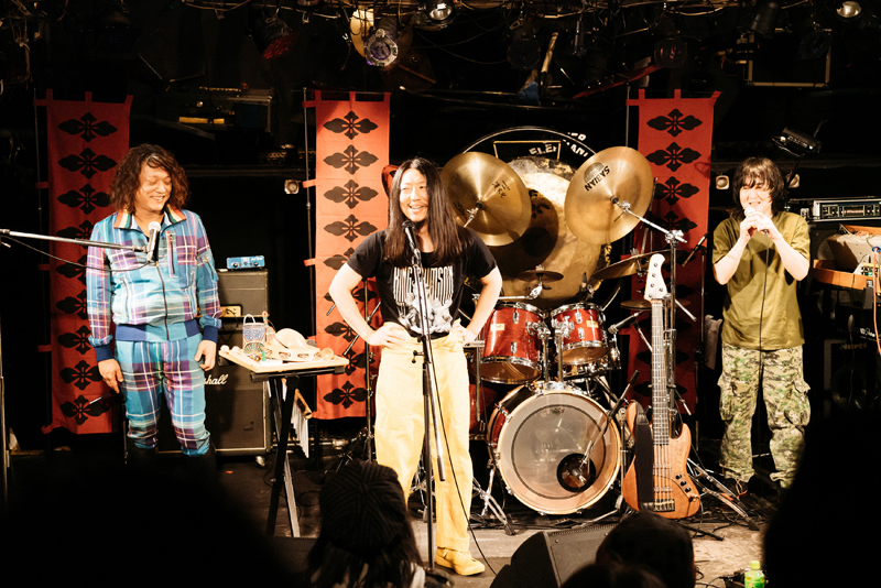 そして、再びアルバム『虚無回廊』から、特撮テーマソング風のナンバー〈星空に消えた少年〉を次に演奏することが告げられる。特撮&アニソンのレジェンド作曲家で2022年6月に他界した渡辺宙明氏(享年96)から本作の作曲指導を受けた思い出が語られ……というより、稲益の仮歌が良くないと宙明氏から怒られたという逸話が印象的だった。同曲は、高木・稲益の高校の同級生だったアニメーション監督の佐野雄太氏によってMVも荒川河川敷で撮られており、この日のバンドのカラフルなステージ衣装は、そのMVの中で着用していたものであることが明らかにされた。そのままメンバー紹介となり、「キーボード・ブルー」「ベース・イエロー」「ドラム・グリーン」「ヴォーカル・ピンク」と戦隊のメンバーとして名が告げられると、必ずしも若くはない面々が少々苦しそうな表情で戦隊ポーズをとっていく。高木だけは自分を「箱男・紅色」と紹介していた。