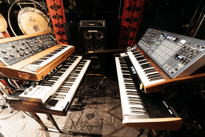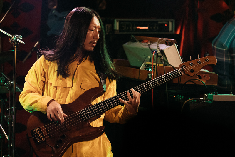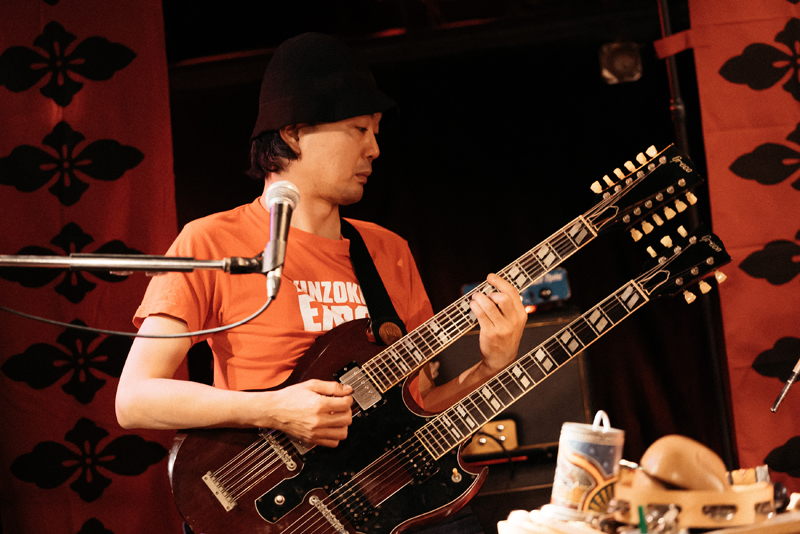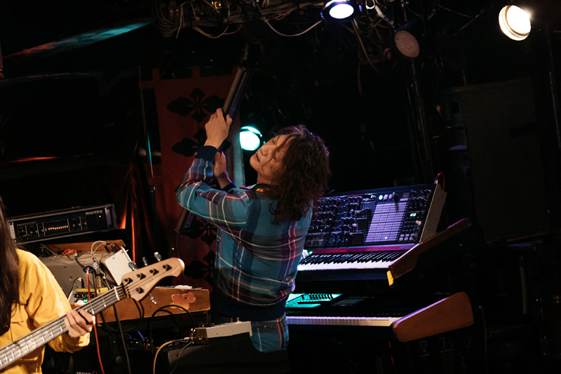 その後、間髪をいれず、3rdアルバム『ハリガネムシ』所収の〈ハリガネムシ〉(作詞・作曲:高木大地)。バンドのレパートリーの中で一番の人気曲といえよう。今回は、通常よりも、いっそう疾走感がみなぎって、新鮮味を感じさせた。その後、疲労困憊気味のメンバーたちのための“小休憩”のようなMCタイムを挟んで、同じアルバム『ハリガネムシ』より〈紅葉狩〉(第三部・第四部)がプレイされる。MJによる泣きのメロトロンから導かれていく叙情性に満ちたこの大作は、めくるめく繰り出される曲展開が心地よい。なかんづく、MJのシンセがリードする7拍子の繰り返しの後に、高木がダブルネック・ギターで13拍子のアルペジオを奏でる箇所が美しくクールで、個人的に最も聴き惚れてしまった。
