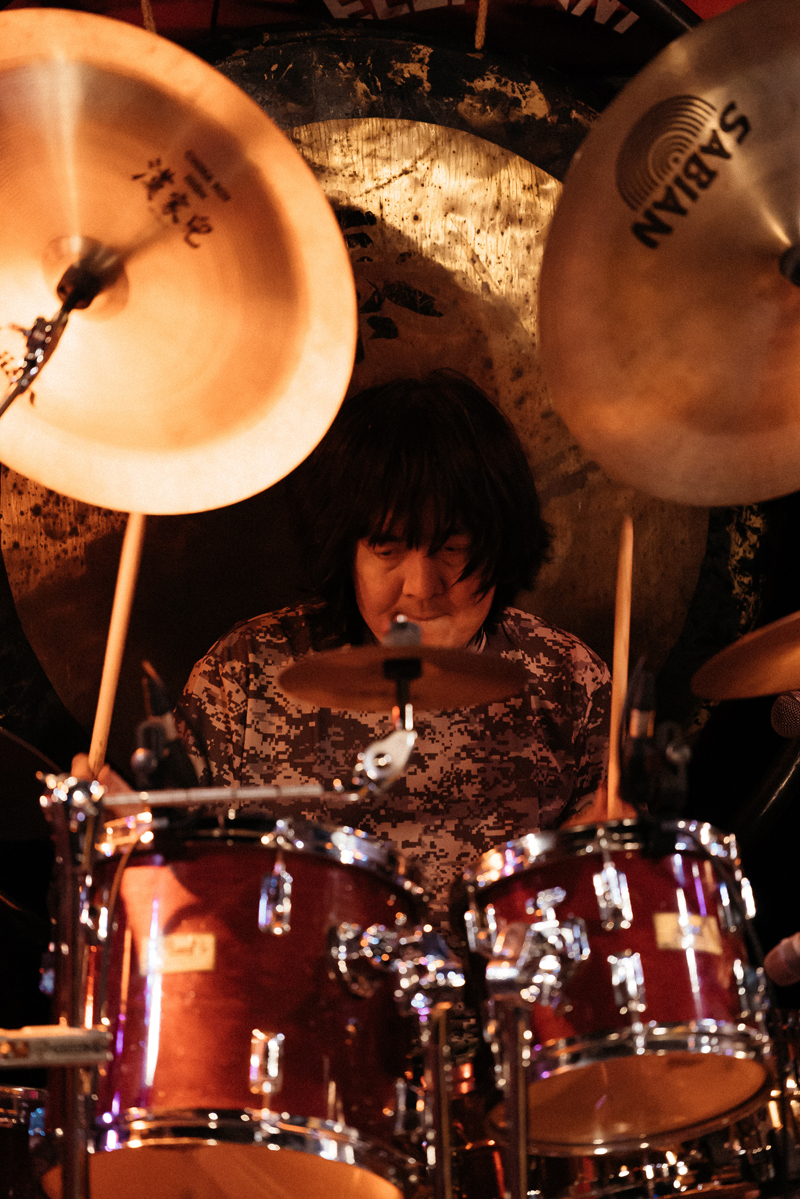 次の曲はアルバム『虚無回廊』に戻り、〈誘蛾灯〉(作詞:高木大地、作曲:高木大地/稲益宏美/栗谷秀貴/後藤マスヒロ/宮嶋健一)。ファズの思いっきり利いたギターがおどろおどろしささえ醸す、ヘヴィなサウンド。続いては、高木のリードヴォーカルで『黒い福音』所収の〈鬼ヶ島〉(作詞・作曲:高木大地)。これは、高木が高校二年の時に作った曲で、当時人間椅子のメンバーだった後藤マスヒロの演奏イメージで書いたドラムパートを、いま実際に後藤が演奏しているという宿命のナンバー。当然だが、全体的に人間椅子からの影響を強く感じさせる。