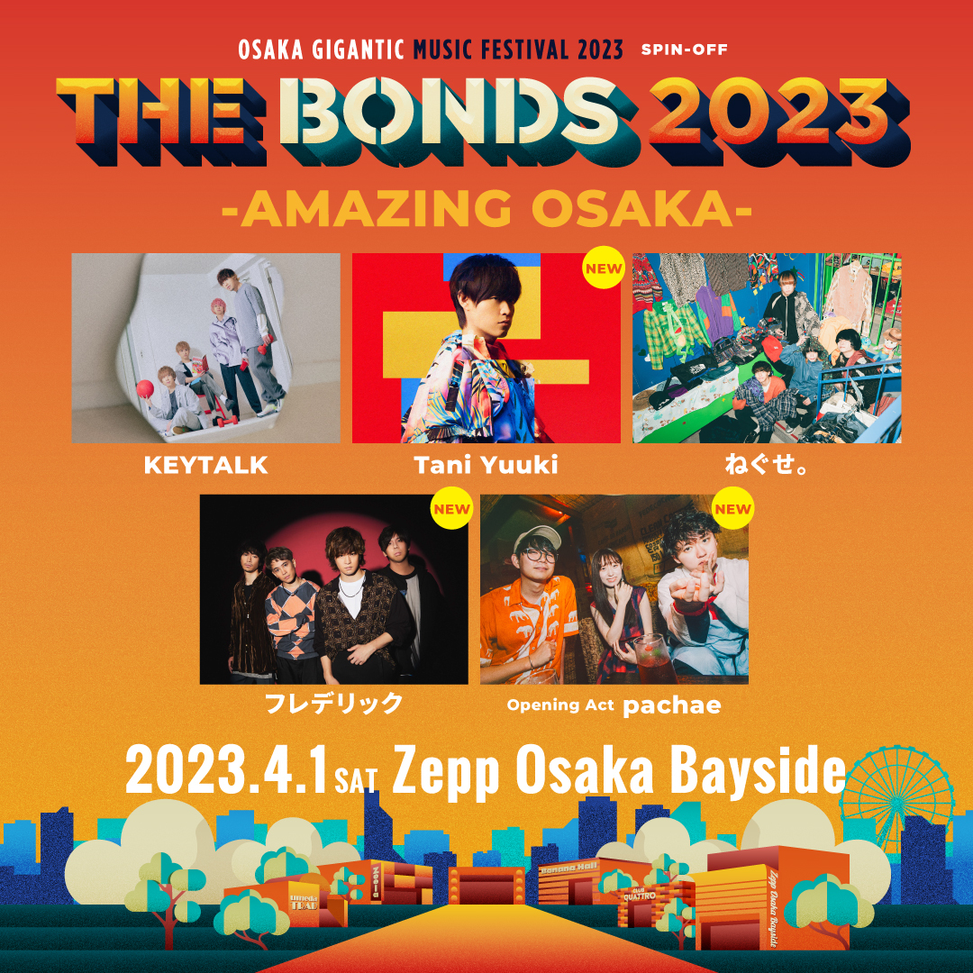 夏のジャイガに向け関西のライブシーンをさらに盛り上げるべく、沢山のアーティストがTHE BONDSに集結。先日発表したKEYTALKとねぐせ。の出演に加え、Tani Yuuki、フレデリック、pachaeの3組が決定した。