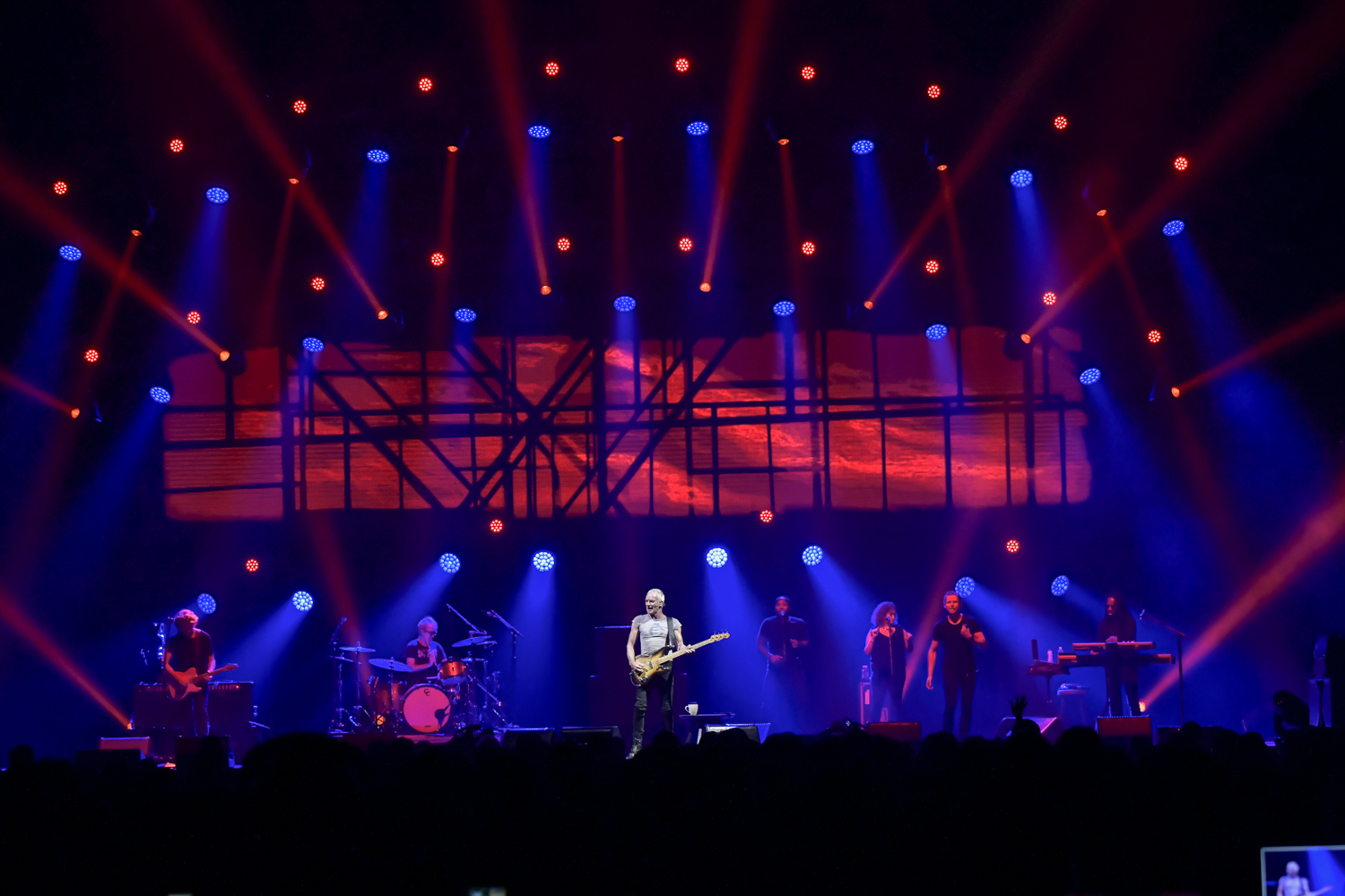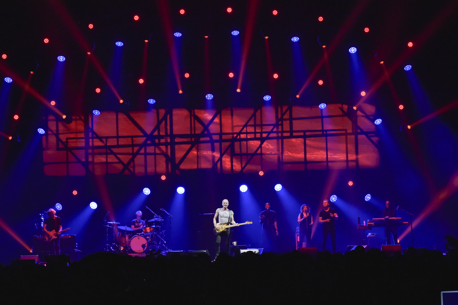 オープニングは「孤独のメッセージ」。昨年から加わった米国東海岸出身のドラマー、ザック・ジョーンズがワン・タムのシンプルなセットで叩き出す重量感があってしかもシャープなリズムに乗って、彼らは、44年前の名曲に新たな生命を吹き込んでいく。ヘッドセット・タイプのマイクを使うようになったスティングが(つまりマイク・スタンドに正対しなくていい)、自由にステージ上を動き、リズムや歌詞にあわせて視線も動かしながら歌うその動的イメージもスティング・バンドの新たな印象に大きく貢献しているようだ。
