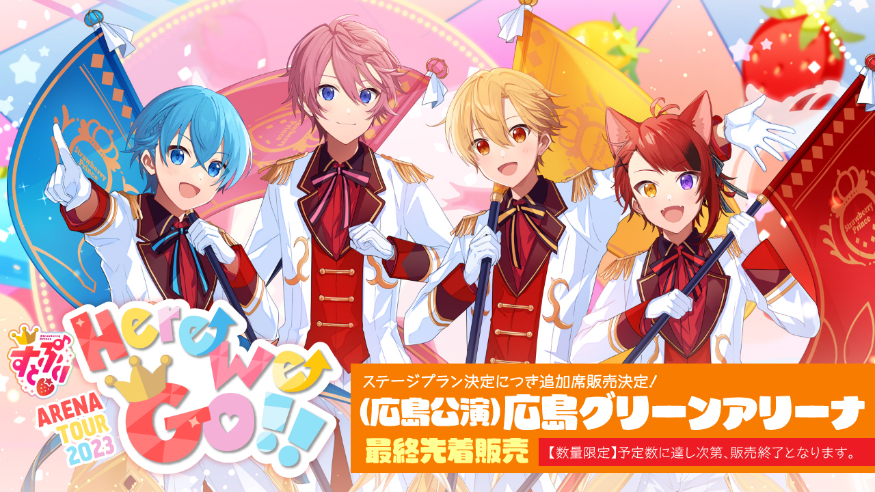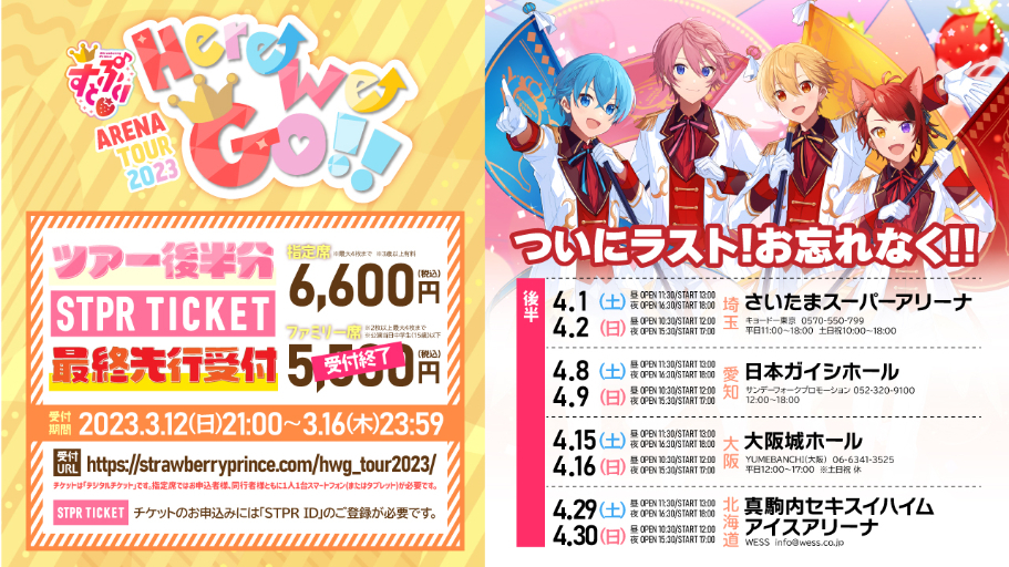 また、2023年1月より開催中の全国アリーナツアー『すとぷり ARENA TOUR 2023 “Here We Go!!“』後半のチケットの最終先行受付が、本日3月12日(日)21時よりSTPR TICKETにてスタートした。受付の締め切りは、3月16日(木)23時59分まで。今回の受付ではファミリー席の取り扱いがない点に注意しよう。