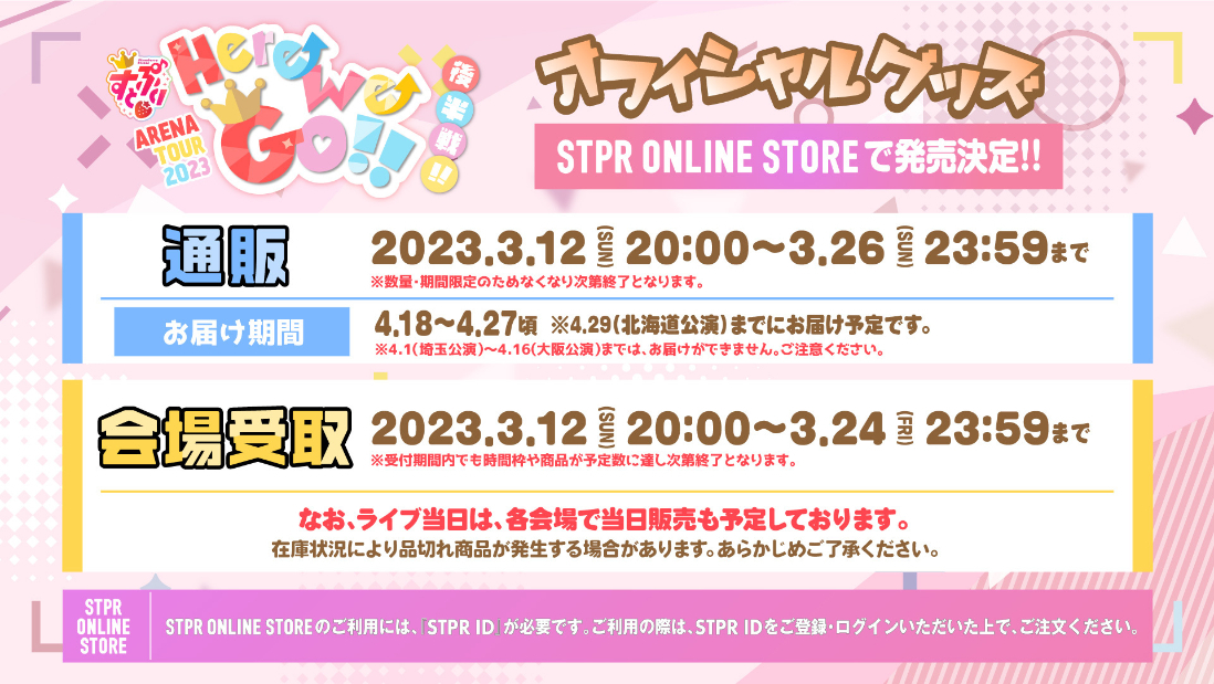 さらに、STPR ONLINE STOREでは、『すとぷり ARENA TOUR 2023 “Here We Go!!“』後半戦グッズ受付がスタート。通販、会場受取ともに数量限定のため、受付期間内でもなくなり次第販売が終了する。