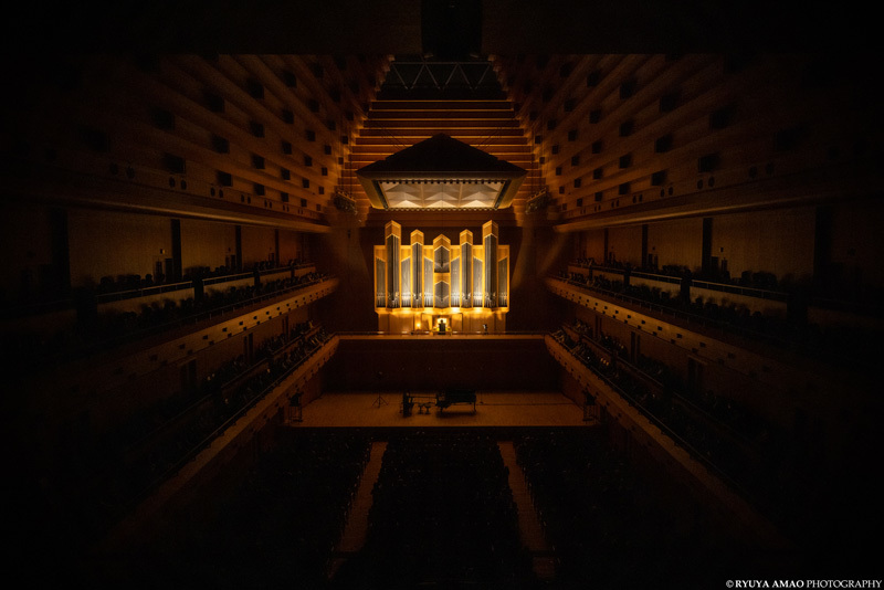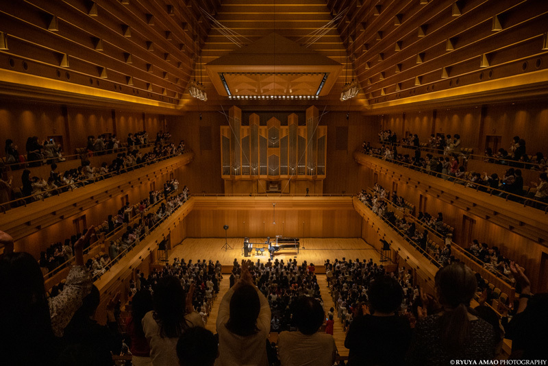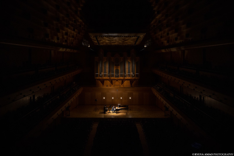 舞台は、東京オペラシティ コンサートホール:タケミツ メモリアル。高い天井にピラミッド型の天窓、その下には巨大なパイプオルガン。礼拝堂を思わせる荘厳な空間に、グランドピアノとアップライトピアノがぽつんと並ぶ。