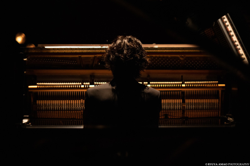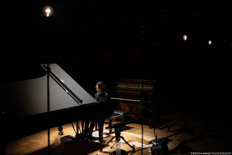 4曲目は、そのアップライトで作曲された「追憶」。ショパンのバラード第2番の旋律を、角野自身が解釈した作品だ。照明が落とされ、スタンドライト一つを残した暗がりは親密で、ピアニストの動きに合わせ揺らぐ光と、浮かび上がるシルエットが美しい。音が響いた瞬間から無意識に潜水し、高い天井へと浮かび上がっていくような感覚に震えた。