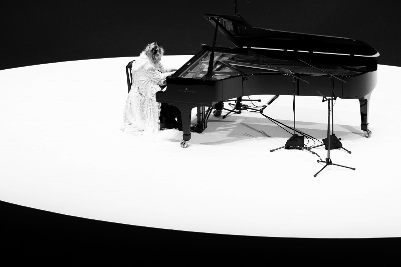 真上からピアノとフジコを俯瞰するカメラと、手元をクローズアップするカメラの映像が、ステージ左右に配されたスクリーンに映し出される。想像以上の迫力と美しさに、オーディエンスは釘付けになる。耳と目に鮮烈な刺激を受けて、オーディエンスはフジコの世界に深く浸っていく。