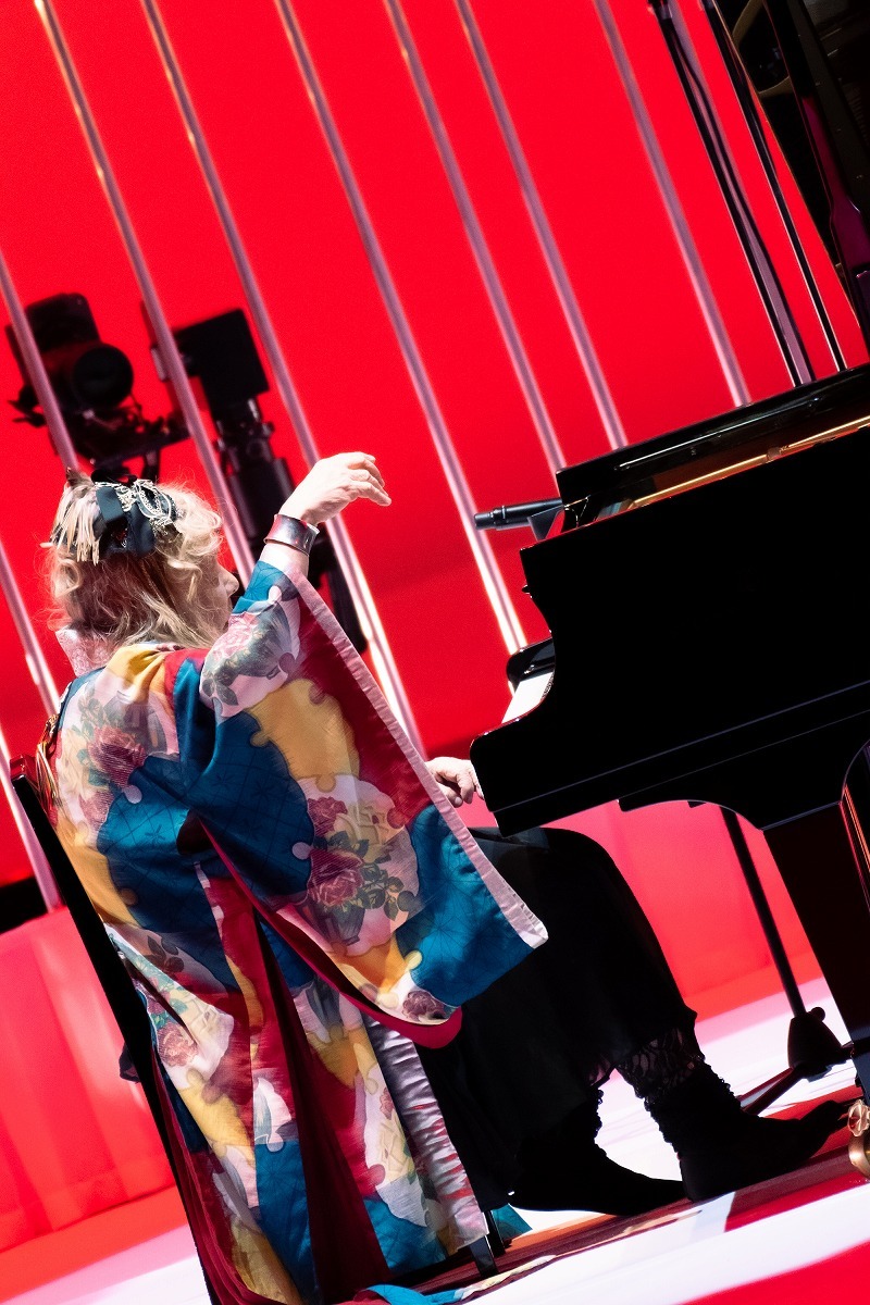ひとしきり拍手を受けたフジコは、座ってドビュッシーの「月の光」を弾き始める。頭上のカメラがフジコの指先とともに、赤や銀の配色があでやかな衣装を映し出す。この衣装はフジコ自身が制作したものだ。「大正時代の着物をアレンジしたの。ヨーロッパで意見を聞くと、『衣装はドレスより着物のほうがいい』ってみんな言うからね。あれはパリで羽織をはおって歩いてるフランス人の男の人がいて、すごくいいなと思って私も真似してみたの(笑)」とフジコ。ステージ全体の色合いと調和して、通常のクラシック・コンサートとは異質の楽しさを醸し出す。