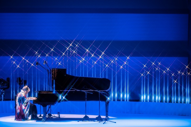 幕が上がると、真っ白だった反響板がブルーのライトで染め上げられ、ピアノの後ろには光を灯した数十本のキャンドルライト風のオブジェが林立している。フジコはといえば、シックでゴージャスな着物風の衣装に身を包んでいる。その美しさにオーディエンスは意表を突かれ、感動の拍手が鳴り止まない。