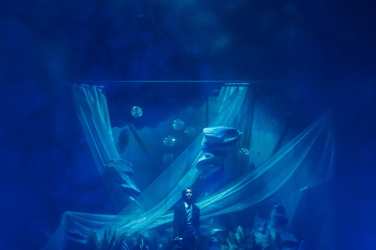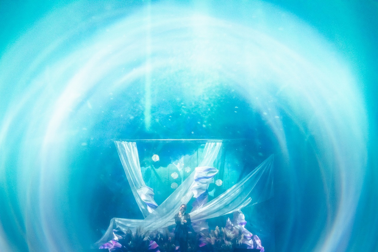 生演奏のピアノとギターとともに披露したメドレーも交えた中盤から、再び映像を挟んでライブは後半戦に突入する。今回はビジョンではなく、ステージ前面を覆う紗幕に映像を投影し、ONEWは海をイメージした香水を調合している模様。そして映像が海の中のような景色に切り替わると、その背後から「In The Whale」を歌うONEWの声が聴こえてくる。演出の効果もあり、幻想的な空間が生まれ、そこに調和するONEWの声の繊細さがより際立つ。そして、曲の中盤で紗幕が落とされると、ダークブルーのセットアップに、腰にスカートを巻いた衣装のONEWの姿をはっきり捉えられるように。そこはかとなく放たれる色気を纏う。続けて女性ダンサーを従えて、新曲の「Expectations」を情熱的にパフォーマンスしたかと思えば、日本語曲「Beauty」も椅子を使った振付でセクシーさを演出。後半戦は攻めの姿勢で観客を翻弄する。